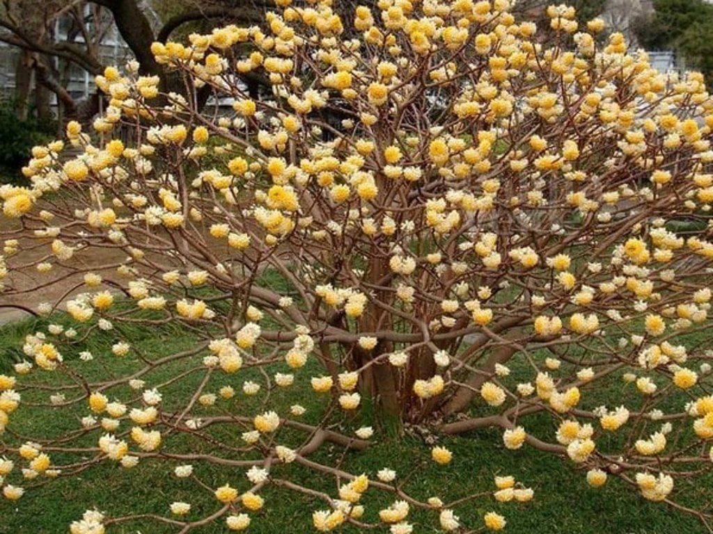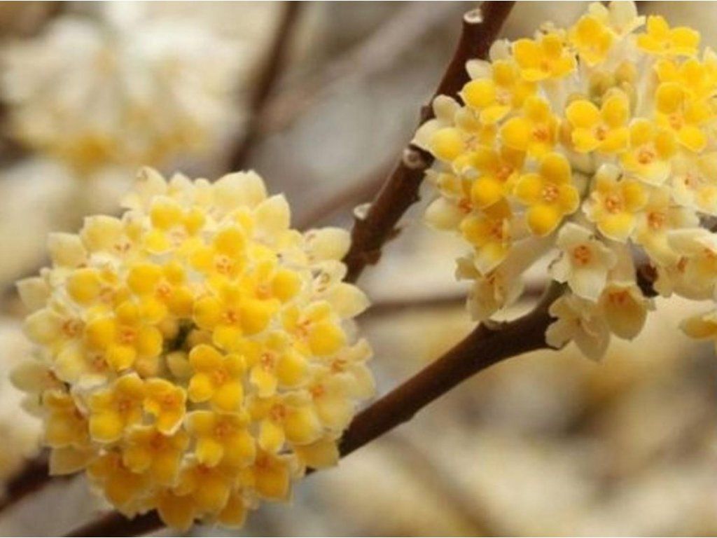 Edgeworthia 'Grandiflora' - stammt aus den feuchten Wäldern und Gebüschen Süd- und Zentralchinas und Myanmars, wo sie auf humosen, gut durchlüfteten Böden wächst. In Asien wurde es auch für den Bast aus der zimtfarbenen Rinde geschätzt, aus dem traditionell feines Papier hergestellt wurde. Die Sorte 'Grandiflora' bildet einen langsam wachsenden, dicht verzweigten, laubabwerfenden Strauch mit kräftigeren Zweigen und schmal-eiförmigen Blättern von etwa 10–20 cm Länge, die erst nach der Blüte austreiben und sich im Herbst oft gelb verfärben. Im Erwachsenenalter erreicht er eine Höhe und Breite von etwa 1,2–1,5 m und bildet eine abgerundete Wuchsform mit einer attraktiven Wintersilhouette. Der größte Vorteil ist die Blüte auf Kahlholz: Von Januar bis März öffnen sich an den Zweigenden kugelige Köpfe aus vielen kleinen, röhrenförmigen Blüten in Gelb bis Gelb-Weiß, die aus fein behaarten Knospen hervorgehen. Der Duft erinnert an Gewürze und zieht an wärmeren Tagen erste Bestäuber an. Der Strauch eignet sich für den Eingangsbereich, unter Fenstern, im Vorgarten und in größeren Gefäßen, wo Duft und Blütenansicht aus der Nähe zur Geltung kommen. Er passt gut zu Christrosen, Zaubernuss, Winterblühern und überwintertem Ziergras.