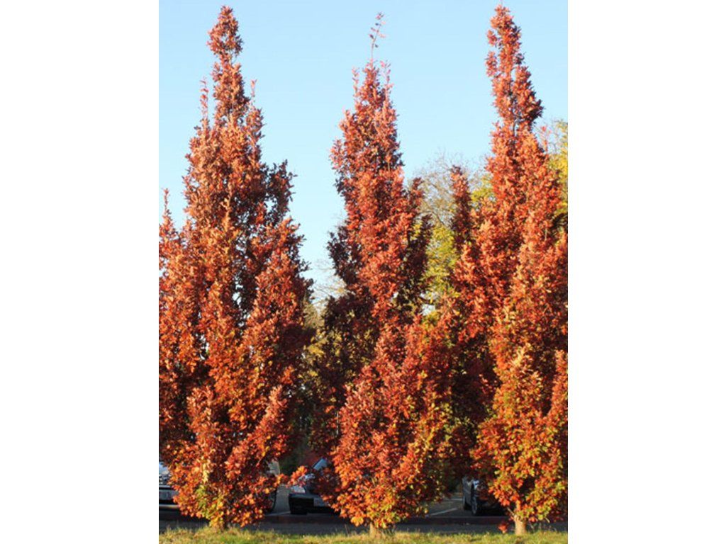 Roteiche 'Crimson Spire' - Eiche, die 10-15 m hoch und etwa 5 m breit wird. Das Wachstum ist säulenförmig. Die Krone ist säulenförmig, später schmal-oval, dunkel und dicht. Die Rinde des Baumes ist hellbraun und gefurcht. Die Blätter sind gelappt, dunkelgrün und 9 - 18 cm lang. Im Herbst verfärben sie sich in rot-violetten Tönen. Im Mai erscheinen gelb-grüne Kätzchen.