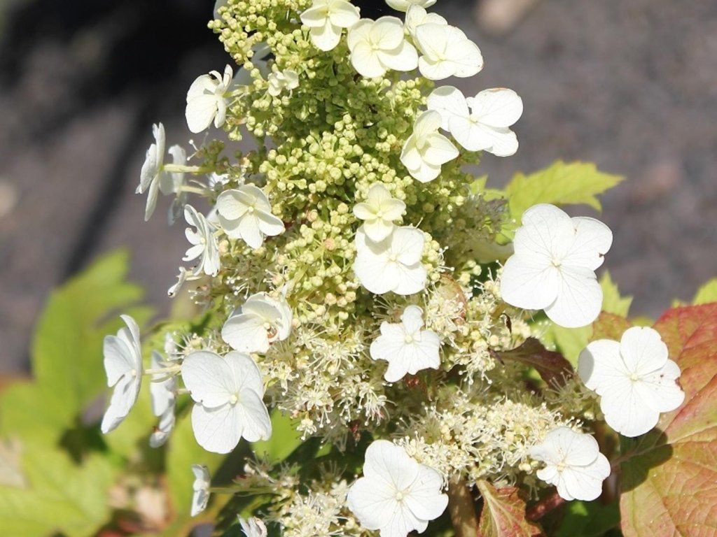 Felsen-Hortensie 'Amethyst' - ein laubabwerfender Strauch, der nicht nur durch seine Blüte, sondern auch durch sein Laub interessant ist. Es erreicht eine Höhe von etwa 1,5 Metern. Die Blütenstände bilden Rispen, die zuerst weiß gefärbt sind und allmählich in ein bezauberndes Rot-Weinrot übergehen. Sie blühen im Sommer reichlich. Die Blätter ähneln, wie der Name schon sagt, Eichenblättern. Sie sind eingeschnitten, während der Saison tiefgrün und leuchten im Herbst in einem weinroten Farbton.