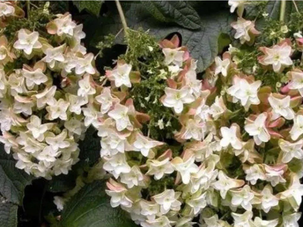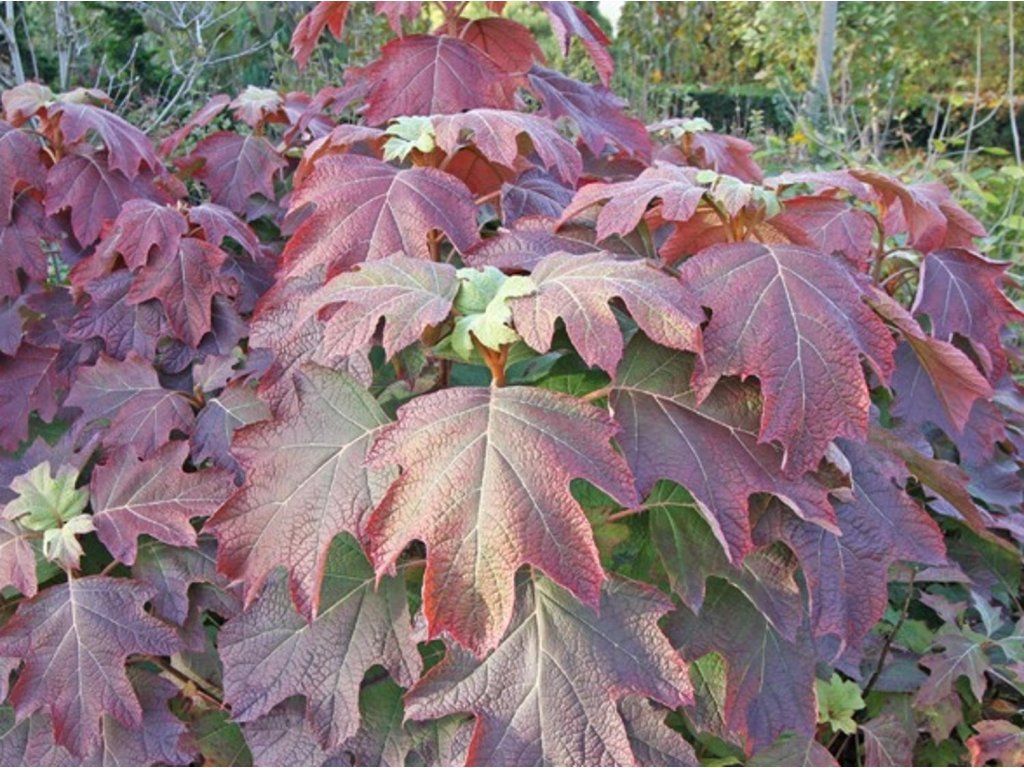 Eichenblättrige Hortensie ´Black Porch´ - wächst auf eine Höhe von 1,5 - 2 m, die Breite ist identisch, sie bildet einen ausladenden und dichten Strauch. Wie der Name schon sagt, ähneln ihre Blätter stark Eichenblättern. Sie sind gelappt, dunkelgrün und mit Beginn der Herbstmonate nehmen sie karminrote Töne an. Ab Juni blühen nach und nach weiße Blüten in Rispen an den Triebspitzen. Mit fortschreitender Zeit, wenn die Nächte im Spätsommer kühler werden, nehmen sie einen hellrosa bis leicht bräunlichen Farbton an. Sie eignet sich gut für die Anpflanzung in Staudenbeeten, kommt aber auch als Solitärpflanze gut zur Geltung.