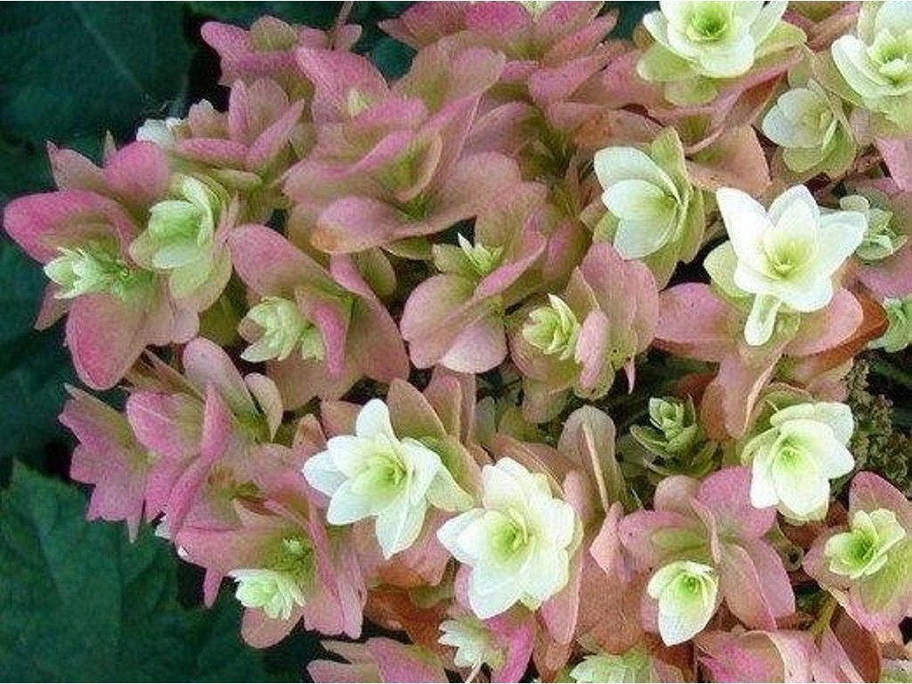 Eichenblättrige Hortensie 'Snowflake' - einer der schönsten und beeindruckendsten Vertreter ihrer Art, der sich durch seine gefüllten Blüten auszeichnet. Sie wächst als ausladender, reich verzweigter Strauch und erreicht im ausgewachsenen Zustand eine Höhe und Breite von 1,5 bis 2 Metern. Die Blätter sind tief gelappt, sattgrün und erinnern in ihrer Textur stark an Eichenblätter. Diese Sorte blüht von Juli bis September und ihre Blütenstände sind wirklich einzigartig. Im Gegensatz zu gewöhnlichen Formen bilden sich sterile Blüten schichtweise übereinander, was den Effekt einer „Blüte in der Blüte“ erzeugt und die gesamten rispenförmigen Blütenstände dadurch sehr voll, schwer und luftig wirken lässt. Die Blüten öffnen sich reinweiß, aber im Laufe des Sommers und mit dem Einzug des Herbstes verändert sich ihre Farbe zu einem zarten Rosa bis hin zu einem satten Weinrot. Aufgrund des Gewichts und der Länge der Blüten, die bis zu 30 Zentimeter erreichen können, neigen die Zweige dazu, sich leicht und elegant zu neigen. Die Herbstfärbung der Blätter ist bei dieser Sorte spektakulär, wobei sich das Laub in Tönen von Mahagoni, Purpur und leuchtendem Rot verfärbt. Im Garten eignet sie sich als wunderschöne Solitärpflanze, die mit ihrer Textur und ihrer ungewöhnlichen Blüte in jeder Komposition Aufmerksamkeit erregt.