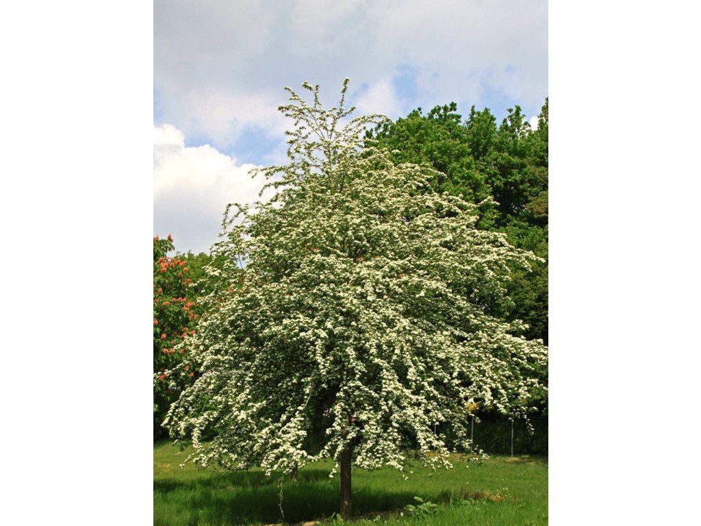 Eingriffeliger Weißdorn - lateinisch Crataegus monogyna, ist eine heimische Gehölzart Europas, Westasiens und Nordafrikas. Er wächst natürlich an Waldrändern, in Gebüschen, an trockenen Hängen und in offener Landschaft, wo er zu den wichtigen stabilisierenden Elementen des Ökosystems gehört. Im Erwachsenenalter erreicht er normalerweise eine Höhe von 5–10 m, ausnahmsweise bis zu etwa 12 m, und eine Kronenbreite von 4–8 m. Er kann als kleiner Baum mit Stamm oder als mehrstämmiger Strauch wachsen. Die Blätter sind tief gelappt, frischgrün und färben sich im Herbst gelb bis orange. Die Blütezeit ist im Mai bis Juni, wenn dichte Blütenstände kleiner weißer Blüten mit auffälligen Staubgefäßen erscheinen, die eine wichtige Nahrungsquelle für Bestäuber darstellen. Die Früchte sind kugelförmige rote Sammelbalgfrüchte mit einem Samen, reifen von September bis Oktober und verbleiben oft bis in den Winter an den Zweigen. Die Zweige tragen deutliche Dornen. Der Weißdorn hat auch eine Bedeutung in der traditionellen Heilkunde, wobei Blüten und Früchte wegen ihres Gehalts an Flavonoiden und anderen Substanzen verwendet werden, ohne gesundheitsbezogene Angaben.