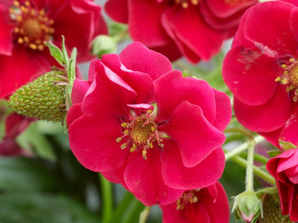 Erdbeere 'Pink Summer Breeze' - eine immer tragende Sorte von Gartenerdbeeren, die Nutzwert und Zierwert in einem kompakten Horst vereint. Sie gehört zur Gruppe der Balkonerbeeren mit auffällig gefärbten Blüten und wird vor allem für ihre lange Blüte- und Fruchtzeit geschätzt. Sie bildet einen niedrigen, dichten bis leicht überhängenden Wuchs, normalerweise etwa 20–30 cm hoch und etwa 30–40 cm breit. Bei der Kultivierung in Hängeampeln können die Triebe leicht über den Rand hängen. Die Blätter sind dreiteilig, mittelgrün, leicht glänzend und bleiben während der gesamten Saison dekorativ. Die größte Attraktion sind die vollen bis halbgefüllten, tiefrosa Blüten, die fast wie kleine Rosen aussehen und von Spätfrühling bis Frühherbst kontinuierlich erscheinen. Neben den Blüten reifen von Juni bis September kleinere bis mittelgroße, kegelförmige, rote Früchte mit süßem, aromatischem Geschmack. Die Sorte eignet sich für den direkten Verzehr, für Sommerdesserts, zur Dekoration von Kuchen und zum Naschen für Kinder direkt von der Pflanze. Die Früchte enthalten Vitamin C, Fruchtsäuren und Antioxidantien und ergänzen so die Ernährung mit fruchtigem Geschmack. Dank der rosa Blüten lässt sich die Sorte gut mit Sommerblumen, Kräutern und Zierblättern kombinieren und wirkt auch ohne weitere Bepflanzung in einem Topf üppig.