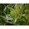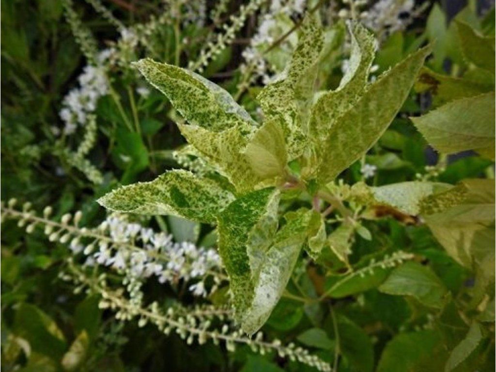 Clethra alnifolia 'Creels Calico' - eine neuere Sorte, die noch eher zu den Sammlerstücken zählt. Das Wachstum des Strauches ist aufrecht, kompakt und erreicht eine Höhe von 1,8 m und eine Breite von 1 m. Er zeichnet sich durch unregelmäßig cremefarben panaschierte, ovalere Blätter auf grünem Grund aus. Im Herbst sind sie orange-gelb und fallen später ab. Die Blüten sind klein, glockenförmig, weiß und bilden lange, ährige Blütenstände. Der Strauch ist stark honigbildend. Um die Form zu erhalten, empfehlen wir einen regelmäßigen Frühlingsschnitt auf 30-40 cm.
