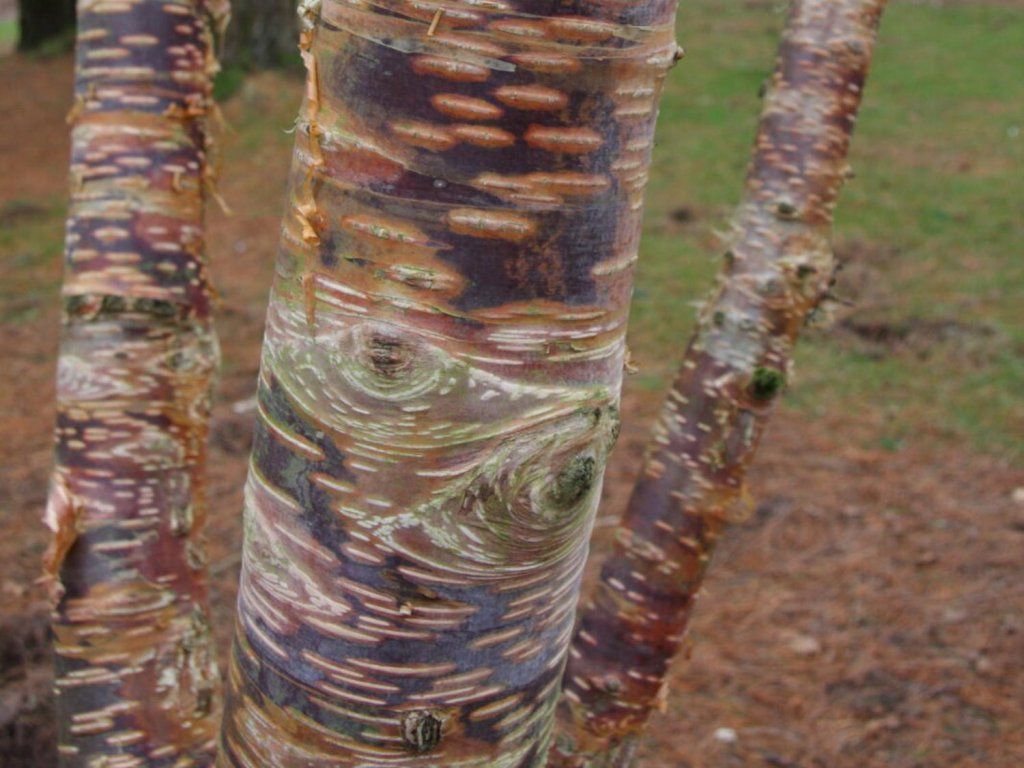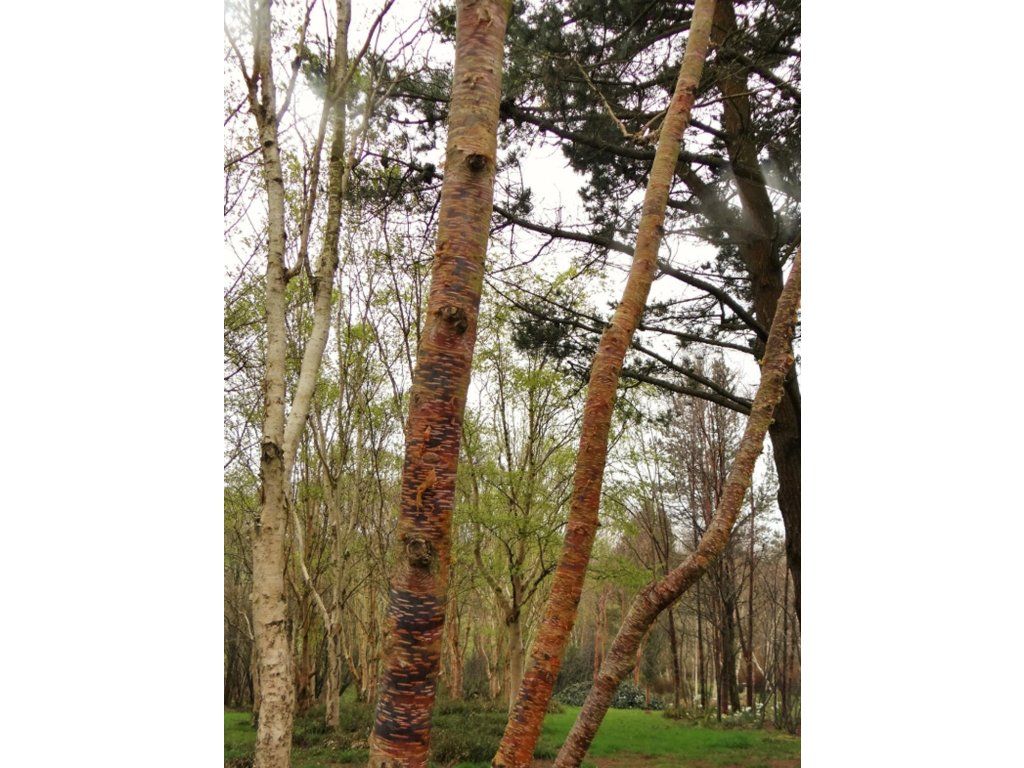 Erlen-Birke 'Mount Zao Purple' - eine ungewöhnliche Birkenart mit dunkelvioletter und orangeroter, abblätternder Rinde die ein fast gestreiftes Aussehen erzeugt. Mittelgrüne Blätter färben sich im Herbst gelb-orange. Sie ist nach dem Vulkan Mount Zao in Japan benannt. Sie erreicht eine Höhe von 18 Metern und bildet eine breite, dichte Krone.