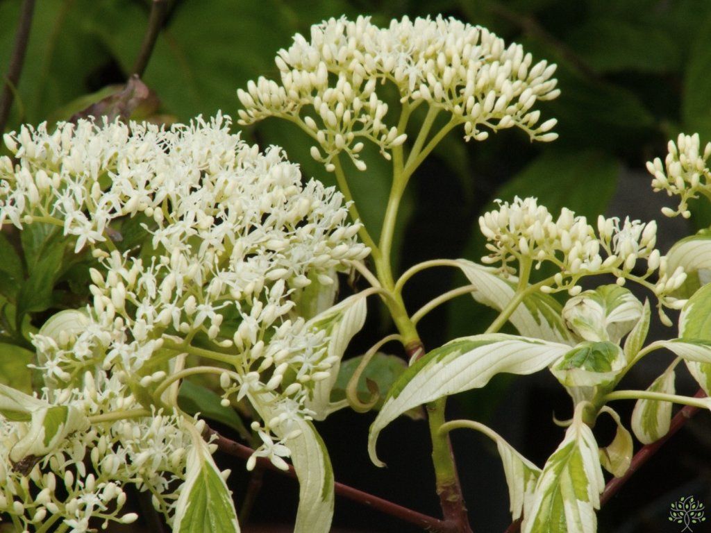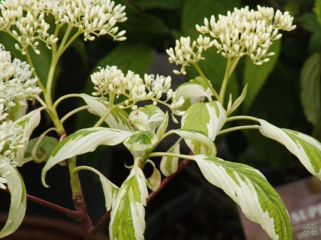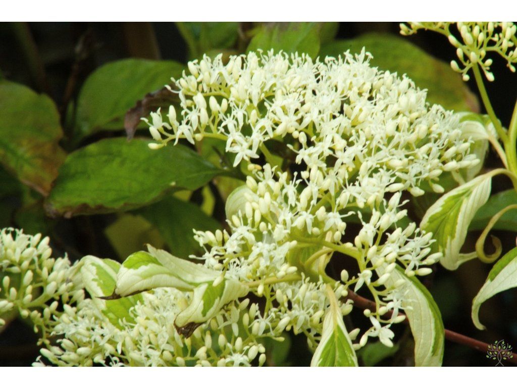 Etagen-Hartriegel 'Gosia' - attraktiver Kultivar, geschätzt für seine auffällig panaschierten Blätter und die elegante etagenweise Verzweigung. Dieser laubabwerfende Strauch oder kleine Baum erreicht eine Höhe von 3–5 Metern und eine Breite von 2–4 Metern, wobei er ein langsames, ausladendes Wachstum mit regelmäßigen Aststockwerken beibehält, was ihm ein einzigartiges Aussehen verleiht. Die Blätter sind länglich, mittelgrün mit einem ausgeprägten, cremeweißen, unregelmäßigen Rand. Die cremefarbenen Teile können auch einen rötlichen Schimmer aufweisen. Im Herbst verfärben sie sich in goldene Töne, was seinen ästhetischen Wert erhöht. Im Frühjahr bis Frühsommer blüht er mit kleinen weißen Blüten, die in flachen Blütenständen angeordnet sind und Bestäuber anlocken. Nach der Blüte können sich kleine blau-schwarze Früchte bilden, die bei Vögeln beliebt sind. Er ist gut frosthart, junge Pflanzen sollten in den ersten Jahren vor starkem Frost und Wind geschützt werden. Er ist die ideale Wahl für mittelgroße Gärten als Solitärpflanze, die durch ihre elegante Form und ihr auffälliges Laub zu einem Blickfang wird. Er eignet sich auch hervorragend für gemischte Pflanzungen oder als Teil von repräsentativen Gartengestaltungen.