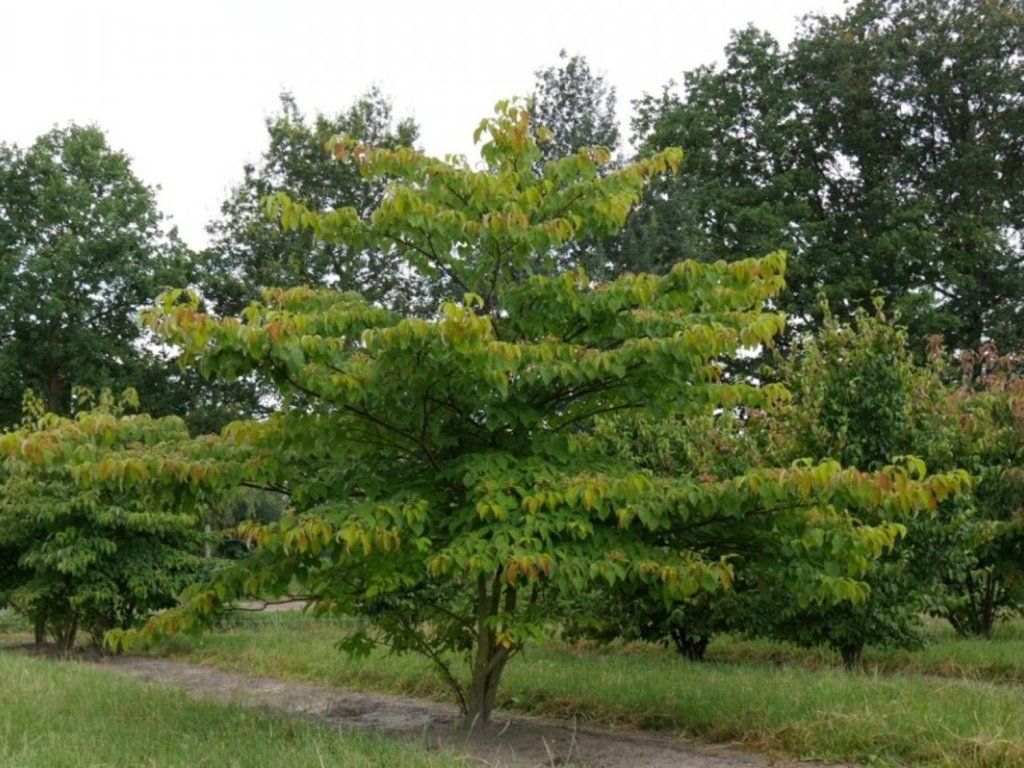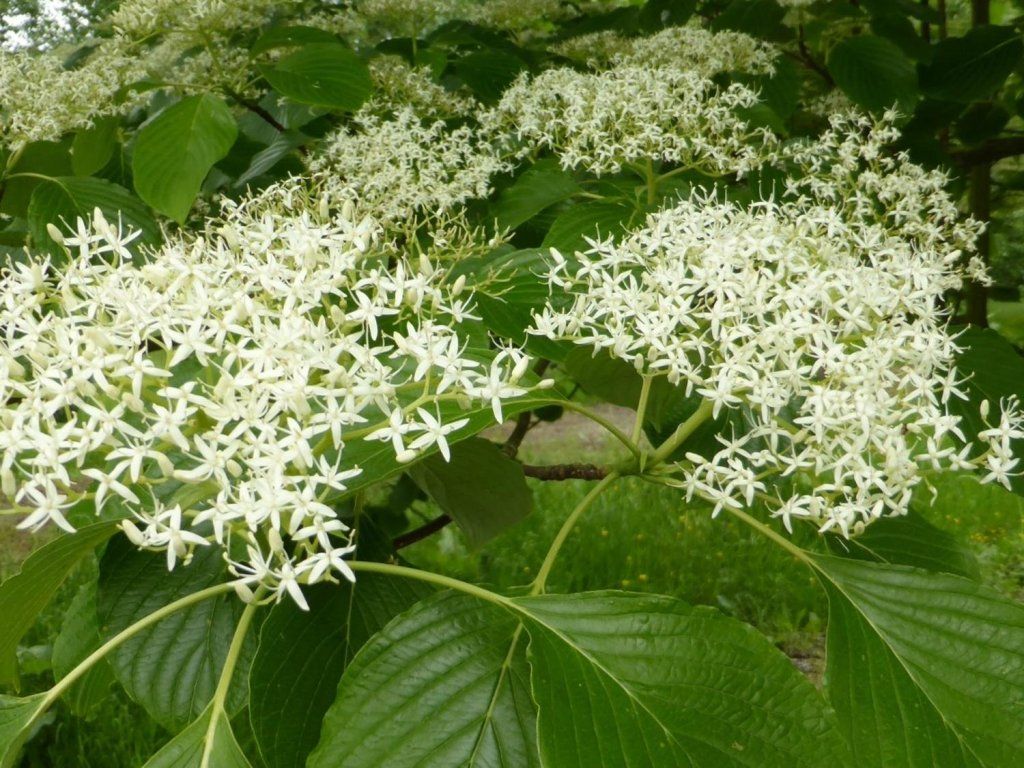 Pagoden-Hartriegel - ein laubabwerfender Strauch, Baum oder mehrstämmiges Gehölz, der bis zu 10 m hoch werden kann. Die Krone kann so breit sein, wie der Baum hoch ist. Das Wachstum der Äste ist oft horizontal, wodurch diese Art ihr einzigartiges Aussehen erhält. Die Zweige ändern ihre Farbe von rotbraun zu grau. Die Blätter sind wechselständig, unregelmäßig in Form und Größe. Sie sind glänzend, dunkelgrün und die Unterseite ist auffallend blaugrün gefärbt. Mit dem Einsetzen des Herbstes verfärbt sich das Laub purpurrot. Die Blüten sind weiß und bilden flachere, schirmrispige Blütenstände. Sie erscheinen im Mai bis Juni. Im Herbst erscheinen dunkelblaue Beeren, aber das ist nicht immer der Fall. Die Pflanze wurzelt insgesamt flach.