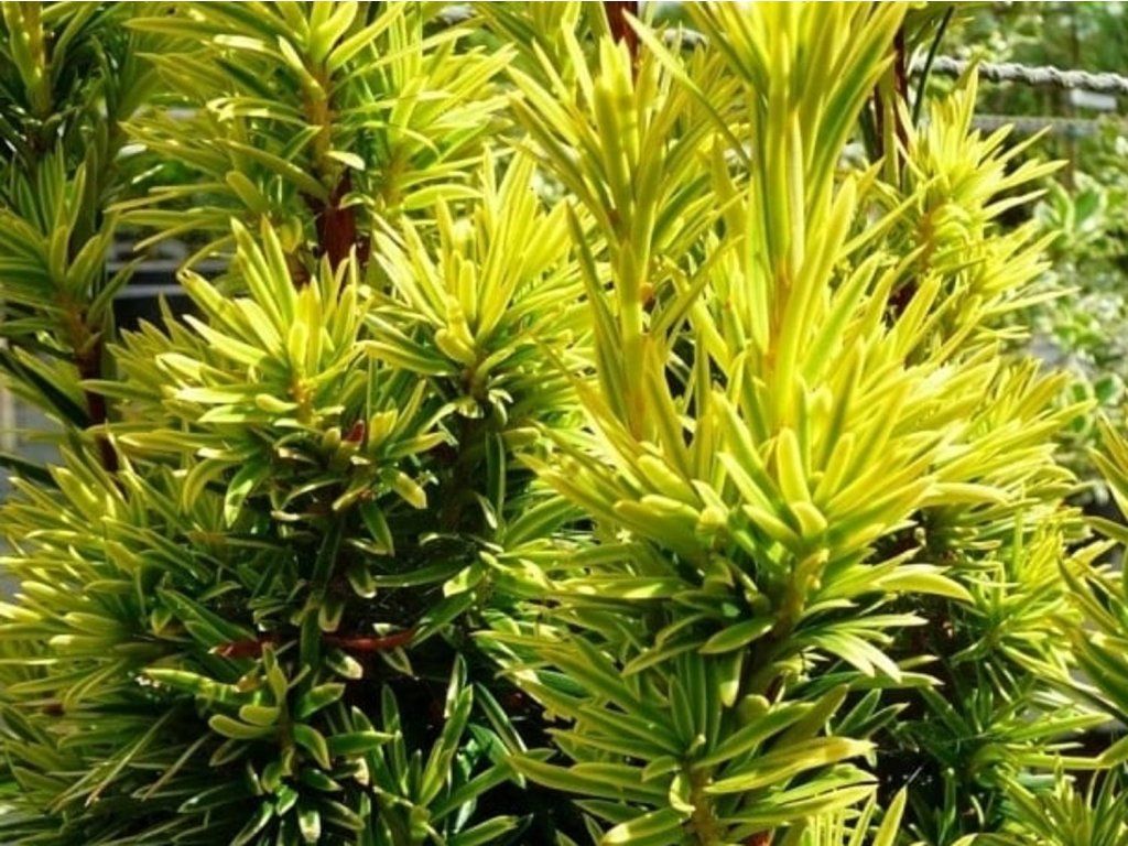Eibe 'Fastigiata Aurea' - schöner, langsam wachsender Strauch mit säulenförmigem Wuchs. Es handelt sich um eine immergrüne Sorte der Rot-Eibe mit streng säulenförmigem Habitus, oft als Goldform der irischen Eibe bezeichnet. Sie bildet eine dichte, aufrechte Verzweigung und erreicht in unseren Verhältnissen normalerweise eine Höhe von 2–4 m bei einer Breite von etwa 0,8–1 m; auf sehr nährstoffreichen Böden kann sie im Laufe der Zeit 4 m überschreiten. Die Nadeln sind flach, etwa 2–3 cm lang, bei jungen Trieben deutlich goldgelb bis limettengrün, im Inneren der Krone eher gelbgrün. Im Frühling, von März bis April, erscheinen unscheinbare Blüten und die Pflanze setzt Pollen frei. Die Eibe ist zweihäusig, bei weiblichen Exemplaren reifen im Herbst rote Samenmäntel mit Samen, die ebenso giftig sind wie die Nadeln und das Holz. Die Sorte wird als schmaler Sichtschutz, vertikale Dominante am Eingang, Solitär für formelle Gärten und in Kübeln verwendet, wo sie durch den Kontrast zu dunkelblättrigen Sträuchern, Buchsbaum, Stechpalmen, Ziergräsern und Schattenstauden besticht. Das Wachstum ist langsam, oft etwa 10–20 cm pro Jahr, was die langfristige Beibehaltung der schlanken Form erleichtert.