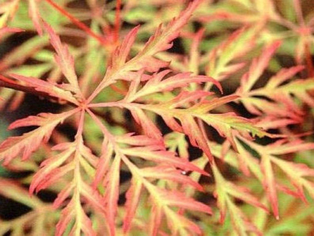Acer palmatum 'Berrima Bridge' - ein einzigartiger Kultivar des Fächerahorns, der eine Höhe von etwa 1,5-2 m erreicht, diese Höhe wird etwa 10 Jahre nach der Pflanzung erreicht. Seine austreibenden Blätter sind hellgrün und färben sich im Sommer grün-orange. Er sieht auch im Herbst schön aus, wenn die Blätter rote und orange Farbtöne aufweisen. Sie sind zart und tief eingeschnitten. Dieser Ahorn wird Sie auf den ersten Blick fesseln.