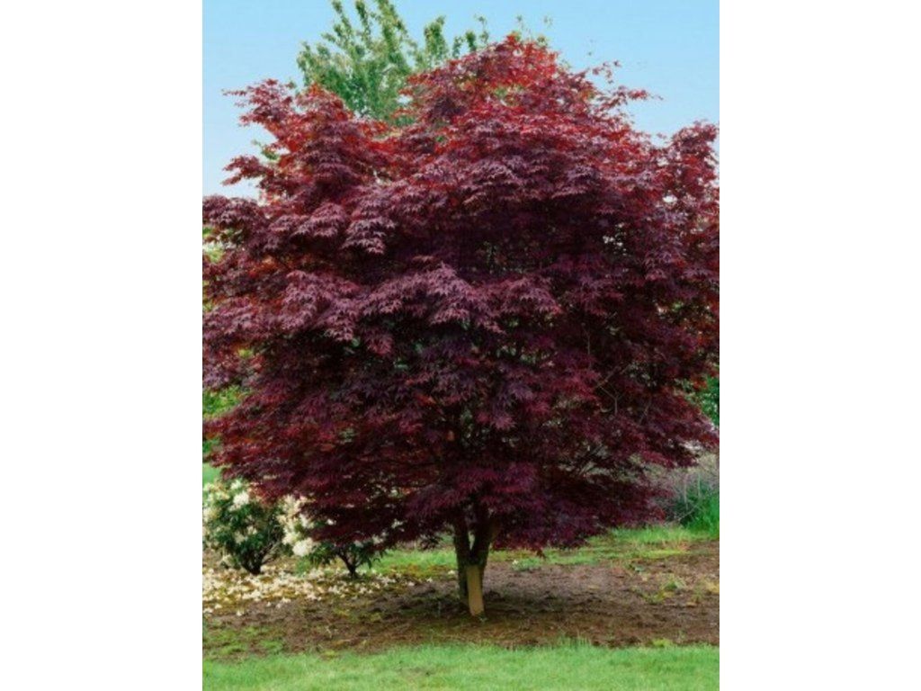 Japanischer Ahorn 'Bloodgood' – eine der beliebtesten Sorten des Japanischen Ahorns, vor allem wegen seines beeindruckenden Aussehens und der ausgeprägten Blattfarbe. Die Blätter von 'Bloodgood' sind handförmig gelappt und haben eine satte dunkelpurpurne Farbe, die während der gesamten Vegetationsperiode intensiv bleibt. 'Bloodgood' ist ein mittelgroßer Baum, der normalerweise eine Höhe von etwa 4–6 Metern und eine Breite von 3–4 Metern erreicht. Im Herbst können sich die Blätter zu tiefroten bis schwarzbraunen Farben verfärben, was eine atemberaubende Herbstkulisse schafft. Auch die Rinde dieses schönen Ahorns ist interessant gefärbt, sie hat eine ausgeprägte, weinrot-violette Farbe. Die Blüten dieser Sorte sind nicht auffällig, eher unauffällig und bilden kleine Blütenstände. Die Hauptattraktion, wie bei anderen Ahornen, liegt in den Blättern selbst. Er hat eine offene und breite Kronenform, was ihn zu einem ausgezeichneten Solitär für den Garten oder einem markanten Element in Gruppenpflanzungen macht. Acer palmatum 'Bloodgood' ist eine beliebte Sorte des Japanischen Ahorns wegen seines ausgeprägten purpurnen Laubes, das einen dramatischen und eindrucksvollen Akzent in den Garten bringt. Die Früchte sind geflügelte Nüsschen. Die Sorte wird als Solitär, in japanischen Gärten, an Wasserelementen oder in Kombination mit Azaleen, Rhododendren und schattenliebenden Stauden verwendet. In Kübeln wirkt er repräsentativ auf Terrassen und Höfen.