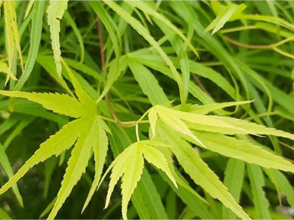 Japanischer Fächerahorn 'Linearilobum' - ein eleganter, ungewöhnlicher Kultivar des Japanischen Ahorns, der zur Gruppe der sogenannten „schmalblättrigen“ Ahorne gehört. Er zeichnet sich durch seine langen, schmalen, fast fadenförmigen Blattlappen aus, die leicht, luftig und sehr zart wirken. Er wächst als mittelgroßer Strauch oder kleiner Baum, normalerweise 2 bis 3 Meter hoch, mit einer schmaleren, aufrechten bis leicht ausgebreiteten Krone. Die Äste sind zart und die Pflanze wirkt auch ohne Blätter sehr leicht und elegant. Die Blätter sind der Hauptschmuck dieses Kultivars. Sie sind tief geteilt in schmale, lineare Lappen, die an Bänder oder zarte Finger erinnern. Das Austreiben im Frühjahr ist hellgrün bis rötlich-bronze, im Sommer geht die Farbe in ein sattes Grün über. Im Herbst verfärben sich die Blätter in Gelb-, Orange- bis Rottönen, was der Pflanze zusätzlichen Zierwert verleiht. Die Frostbeständigkeit ist gut, etwa bis –20 °C, junge Pflanzen schätzen jedoch einen Winterschutz des Wurzelbereichs. Dank seines einzigartigen Laubes und seiner eleganten Form eignet sich der Linearilobum hervorragend als Solitärpflanze, für japanische Gärten, Eingänge, Wasserelemente oder als kontrastierendes Element neben breitblättrigen Sträuchern. Auch in größeren Kübeln macht er eine gute Figur, wo seine Struktur zur Geltung kommt.