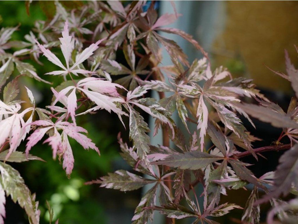Japanischer Fächerahorn 'Rainbow Sister' - Kultivardes japanischen Ahorns mit aufrechtem, breitem Habitus und mittlerem Wachstum. Seine Höhe beträgt nach 10 Jahren ca. 180 - 240 cm. Die Blätter sind gelappt, schmal, stark eingeschnitten mit einer ausgeprägten pastellrosa Panaschierung. Geeignet als Solitärpflanze, auch für kleinere Gärten oder größere Behälter.