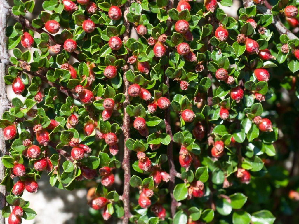Cotoneaster horizontalis var. perpusillus - langsam wachsender, laubabwerfender Strauch, der je nach Wachstumsbedingungen eine Höhe von 50-80 cm erreicht. Ende des Frühlings erscheinen rosa Blüten, die eine Anziehungskraft für Honigbienen darstellen. Später bilden sich rote Beeren am Strauch. Die Zweige sind abgeflacht und wachsen horizontal. Die Blätter sind eiförmig, leicht glänzend und dunkelgrün gefärbt. Im Herbst verfärben sie sich rot bis braun. Als Solitärpflanze kommt er wunderschön zur Geltung.