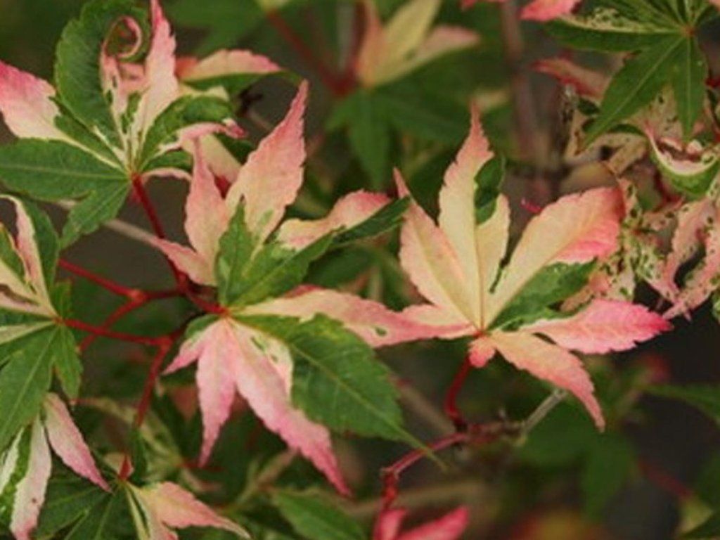 Japanischer Fächerahorn 'Asahi-Zuru' – gehört zu den traditionellen japanischen Kultivaren des Fächerahorns, die für ihre ausgeprägten Blattpanaschierungen geschätzt werden. Der Name lässt sich als „Morgensonne auf dem Kranich“ übersetzen, was die zarten Rosatöne der jungen Triebe wiedergibt. Im Erwachsenenalter erreicht er eine Höhe von etwa 3–4 m und eine Breite von 2–3 m. Die Krone ist breit ausladend bis leicht aufrecht, mit einer feinen, leichten Struktur. Die Blätter sind 5–7-lappig, 6–10 cm breit, hellgrün mit unregelmäßiger cremeweißer Panaschierung. Beim Austrieb haben sie einen rosafarbenen Schimmer, der besonders an den Blatträndern und jungen Zweigen sichtbar ist. Im Laufe des Sommers behält die Sorte ihre kontrastreiche Zeichnung, im Herbst färbt sie sich in gelb-orange bis hellrote Töne. Im Mai erscheinen kleine purpurne Blüten, gefolgt von roten Flügelnüssen. Die Sorte eignet sich hervorragend als Solitärpflanze in kleineren Gärten, in japanischen Arrangements oder in Kombination mit dunkelblättrigen Sträuchern, wo der Kontrast der Panaschierung noch stärker zur Geltung kommt.