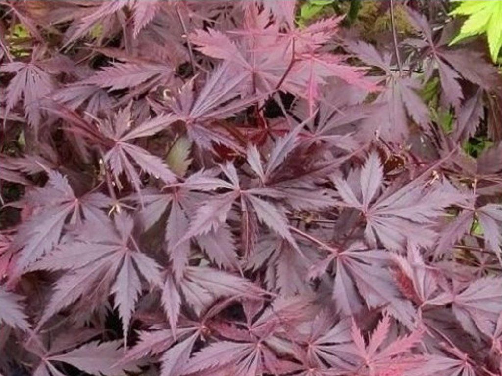 Japanischer Fächerahorn 'Black Lace' - ein aufrecht wachsender Strauch oder kleiner Baum, der innerhalb von 20 Jahren eine Höhe und Breite von etwa 3,5 m erreicht. Er zeichnet sich durch seine handförmigen, 5-teiligen, lanzettlichen, tief eingeschnittenen Blätter mit gesägten Rändern aus. Die Blätter haben eine dunkelrotviolette bis kastanienbraune Farbe. Im Herbst verfärben sie sich leuchtend rot.