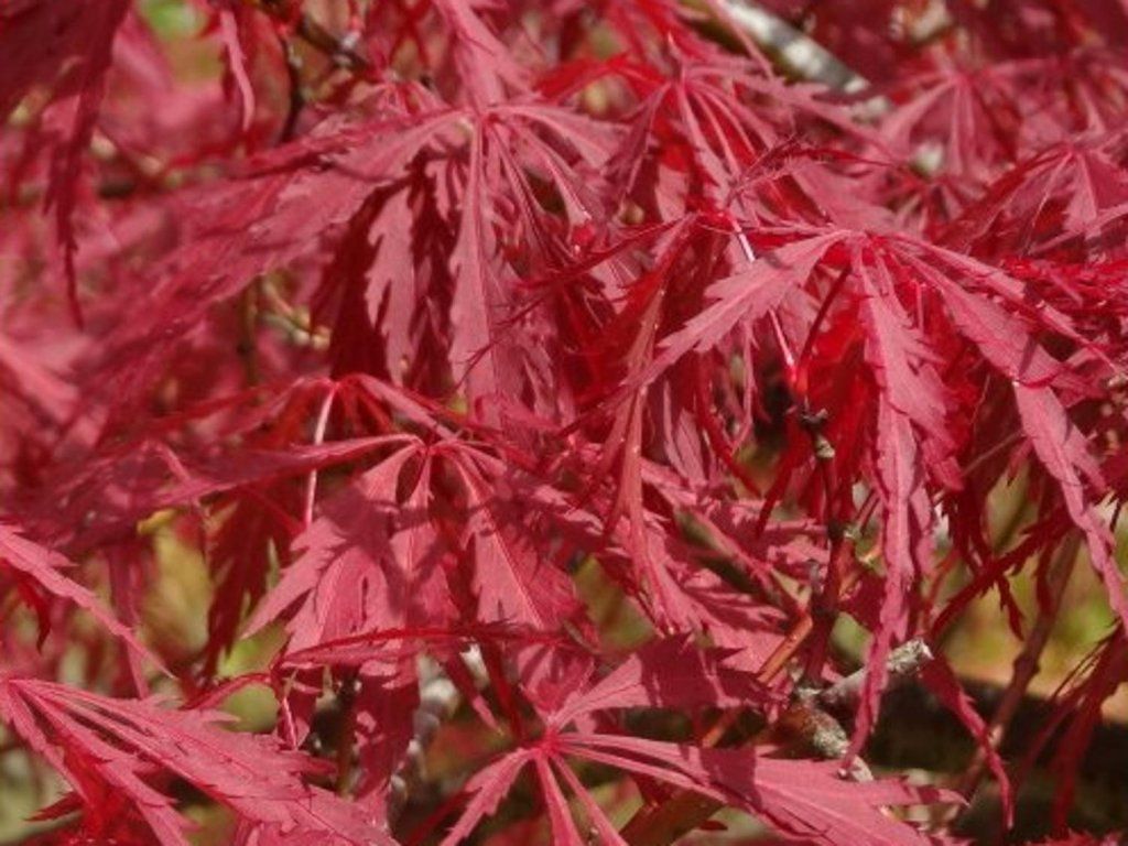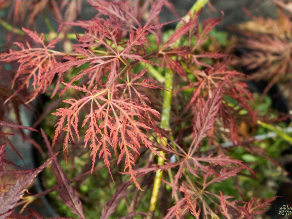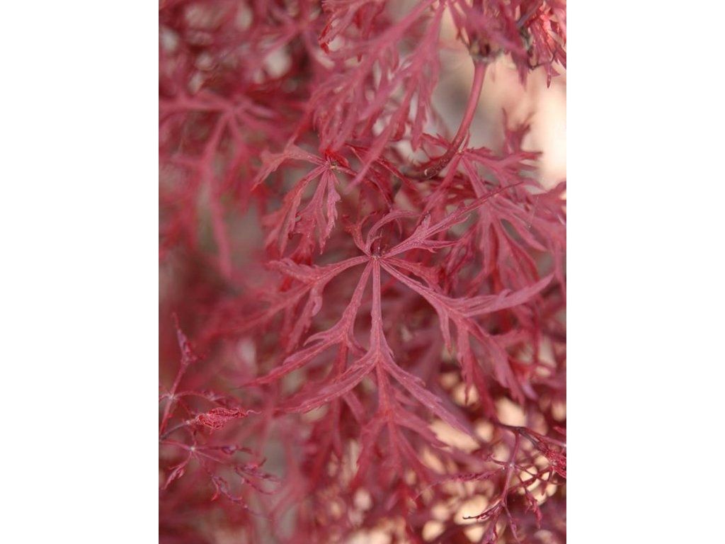 Japanischer Fächerahorn 'Dissectum Garnet' - die Sorte gehört zur Gruppe Dissectum mit sehr tief geteilten, fein geschlitzten Blättern und überhängendem Habitus. Die Grundart stammt aus Waldrändern und Berghängen Japans, Koreas und Chinas, wo sie im lichten Schatten und in humosen Böden mit gleichmäßiger Feuchtigkeit als Unterwuchs wächst. Die Sorte gilt seit langem als zuverlässige rotlaubige Wahl und erhielt in Europa die Auszeichnung RHS AGM. Sie bildet einen langsam wachsenden Strauch bis zu einem kleinen Baum mit kaskadenartig überhängenden Ästen, im ausgewachsenen Zustand normalerweise 2–2,5 m × 2,5–3 m. Auf einem Stamm veredelt bildet er eine halbkugelförmige Krone, in Strauchform ist er breiter als hoch. Im Vergleich zur ähnlichen Sorte 'Crimson Queen' ist er robuster und erreicht mit der Zeit eine größere Breite. Die Blätter sind 5–7-lappig, fein geschnitten, oft 6–10 cm, im Frühling rot-orange, im Sommer dunkelweinrot und im Herbst rot. Im Mai erscheinen kleine purpurne Blüten ohne ausgeprägten Duft, nach der Bestäubung reifen geflügelte Nüsschen. Findet Anwendung als Solitärpflanze auf Terrassen, an Wasserelementen und in größeren Kübeln, wo die Blattzeichnung zur Geltung kommt. In japanisch inspirierten Kompositionen bildet er einen feinen, gewölbten Akzent. Passt gut zu japanischen Azaleen, Rhododendren, Funkien, Farnen und zarten Ziergräsern.