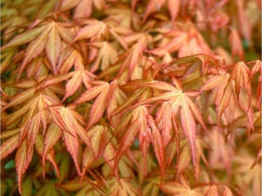 Japanischer Ahorn 'Katsura' - ein wunderschöner und sehr beliebter Kultivar des japanischen Ahorns, der vor allem für seine ausgeprägte orange-aprikosenfarbene Frühlingsfärbung geschätzt wird. Er gehört zu den kleineren, langsamer wachsenden Sorten, die sich auch für kleinere Gärten oder die Kübelpflanzung eignen. Er wächst als kompakter Strauch oder kleiner Baum, normalerweise 2 bis 3 Meter hoch, mit einer abgerundeten, leicht ausladenden Krone und dünnen Ästen. Sein Wachstum ist regelmäßig und ziemlich dicht, sodass er in jeder Pflanzung elegant wirkt. Die Blätter sind der Hauptschmuck; im Frühling treiben sie in leuchtenden Aprikosen-, Orange-, Gelb- und Rosatönen aus, oft mit einem ausgeprägten roten Rand. Diese Farbkombination ist eine der eindrucksvollsten Frühlingsfärbungen unter den japanischen Ahornen. Im Sommer verfärben sich die Blätter hell- bis mittelgrün, während sie sich im Herbst wieder in orange-gelbe bis goldene Töne verfärben. Die Frostbeständigkeit liegt bei etwa –20 °C; junge Pflanzen schätzen eine winterliche Mulchschicht und einen geschützten Standort. Dank seiner geringen Größe und seiner leuchtenden Farben eignet er sich hervorragend als Solitärpflanze, für japanische Gärten, Vorgärten, an Teiche oder für die Kübelbepflanzung in größeren Gefäßen. Lässt sich sehr gut mit Nadelgehölzen, Farnen und dunkelblättrigen Stauden kombinieren, die ihre leuchtenden Frühlingsfarben hervorheben.