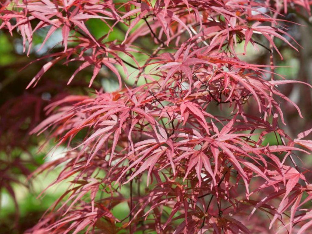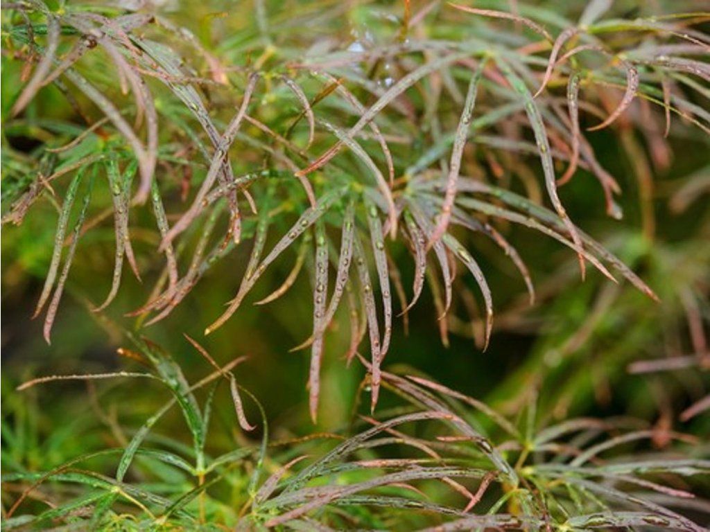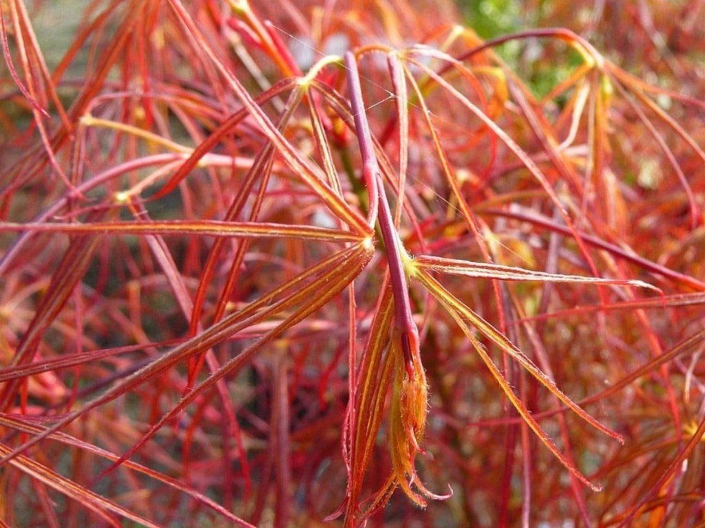 Japanischer Fächerahorn 'Red Pygmy' - eine einzigartige Sorte des Japanischen Fächerahorns aus den USA, die in der zweiten Hälfte des 20. Jahrhunderts in Kultur genommen wurde. Er gehört zu den schmalblättrigen Formen, manchmal den Linien linearilobum zugeordnet, die sich durch sehr schlanke, tief geteilte Blätter auszeichnen. Die Blattlappen sind schmal, bandförmig, 5–7-lappig, bei Austrieb hellrot, im Sommer dunkelpurpurn bis weinrot und im Herbst leuchtend karminrot. Die Sorte bildet eine aufrechte, allmählich leicht ausladende Wuchsform mit feiner Kronentextur aus. Im Erwachsenenalter erreicht sie eine Höhe von ca. 2–3 m und eine Breite von 1–1,5 m, die jährlichen Zuwächse betragen etwa 15–25 cm. Die Blüten sind klein, rotviolett, erscheinen im April bis Mai, die Frucht sind typische geflügelte Nüsschen. Dank der schmalen Blätter wirkt sie leicht und luftig, sie kontrastiert gut mit Pflanzen mit breiten Blättern, zum Beispiel Funkien oder Rhododendren. Sie wird als Solitär, für kleinere Gärten und als markantes Element in Kübeln auf Terrassen verwendet.