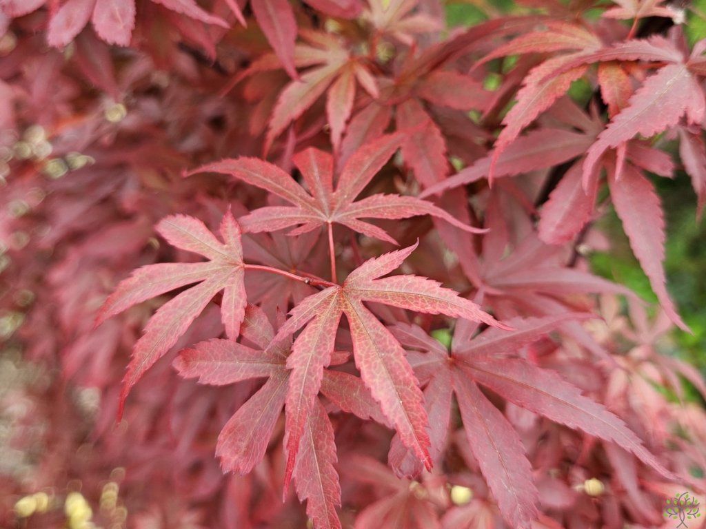 Japanischer Ahorn 'Skeeter's Broom' – ein Kultivar des Japanischen Ahorns, der für seine interessante Form und sein kompaktes Wachstum bekannt ist. Unter unseren Bedingungen bildet er einen langsam wachsenden, schmal aufrechten, dicht verzweigten Strauch von etwa 1–2 m Höhe bei vergleichbarer Breite, im höheren Alter an einem günstigen Standort leicht höher. Der Habitus ist schmal bis säulenförmig und behält seine Form gut ohne starken Schnitt, sodass er nur wenig Platz einnimmt. Die Blätter sind kleiner als bei vielen anderen Kultivaren, handförmig gelappt, meist fünflappig, mit schmalen, fein gezähnten Lappen. Im Frühjahr treibt er leuchtend rot aus, im Sommer geht er in ein tiefes Purpurrot über und im Herbst färbt er sich in rubinrote bis scharlachrote Töne. Dank seines hohen Anteils an rotem Farbstoff behält der Strauch über den größten Teil der Saison einen ausgeprägten Farbton und bildet einen beständigen Farbakzent zwischen grünen Gehölzen. Die Frühlingsblüten sind klein, purpurrot, eher unauffällig und aus der Nähe wahrnehmbar, ergänzen aber das junge Laub. Der Kultivar 'Skeeter's Broom' eignet sich als Solitär in kleineren Gärten, Vorgärten und in Kübeln auf Terrassen und Balkonen. Er wirkt gut in Kombination mit Rhododendren, Azaleen, Zwergnadelgehölzen, Gräsern und Farnen, wo sein rotes Laub mit den grünen und blaugrünen Tönen der umliegenden Bepflanzung kontrastiert. In modernen Beeten kann er ein markantes vertikales Element zwischen niedrigen Stauden und Ziergräsern bilden.