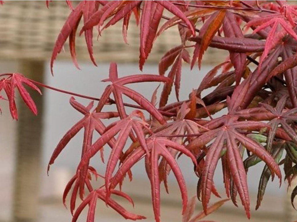 Japanischer Ahorn 'Starfish' - ein elegant wachsender Strauch mit aufrechtem, kompaktem Wuchs. Wächst über 20 Jahre zu einer Höhe von 2 m und einer Breite von 0,75 m heran. Seine Blätter sind tief eingeschnitten, die einzelnen Lappen sind schmal und lang. Die Farbe wechselt im Laufe des Sommers von bronzegrün zu dunklerem Rot; im Herbst ist sie leuchtend rot. Ist bis -22°C frostbeständig.