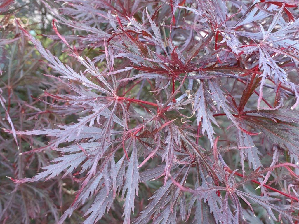 Japanischer Fächerahorn 'Stella Rossa' - eine Pflanze mit überhängenden Ästen, die eine Höhe von etwa 2,5 - 3 m und eine Breite von ca. 4 m erreicht. Die Blätter sind tief, aber fein geschnitten. Junge Blätter sind rosarot, mit der Zeit ändert sich die Farbe zu purpurrot bis dunkelrot. Im Herbst sind sie hellrot oder karminrot gefärbt. Sie sind 7-lappig, etwa 9 - 12 cm lang. Insgesamt wirkt dieser Ahorn luftig. Eine ideale Solitärpflanze, die auch für kleinere Gärten geeignet ist.