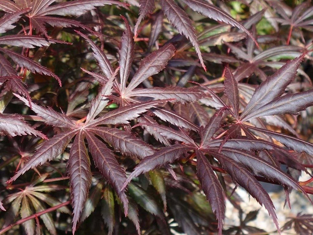 Japanischer Fächerahorn 'Trompenburg' - ein japanischer Ahorn, der eine Höhe von 3-6 m und eine Breite von 2-4 m erreicht. Anfänglich können die jährlichen Zuwächse je nach Kulturbedingungen bis zu etwa 40 cm betragen. Die Krone ist schirmförmig, halbkugelig. Große, fächerförmige Blätter haben 7-9 Lappen und sind tief geteilt. Die Ränder sind nach unten gebogen. Austreibende Blätter haben eine ausgeprägte rote Färbung, anschließend ändert sich die Farbe zu weinroten Tönen mit Beimischung von Braun und Bronze. In den Herbstmonaten zeigen sich dann karminrote und ausgeprägte weinrote Töne. Eine auffälligere Färbung erzielt er an einem sonnigen Standort, er leidet nicht unter Sonnenbrand. Im Frühjahr blüht er mit Flügelnussfrüchten in Rot bis Orange. Die Pflanze eignet sich als Solitärpflanze, findet aber auch in der Gruppenpflanzung ihren Platz.
