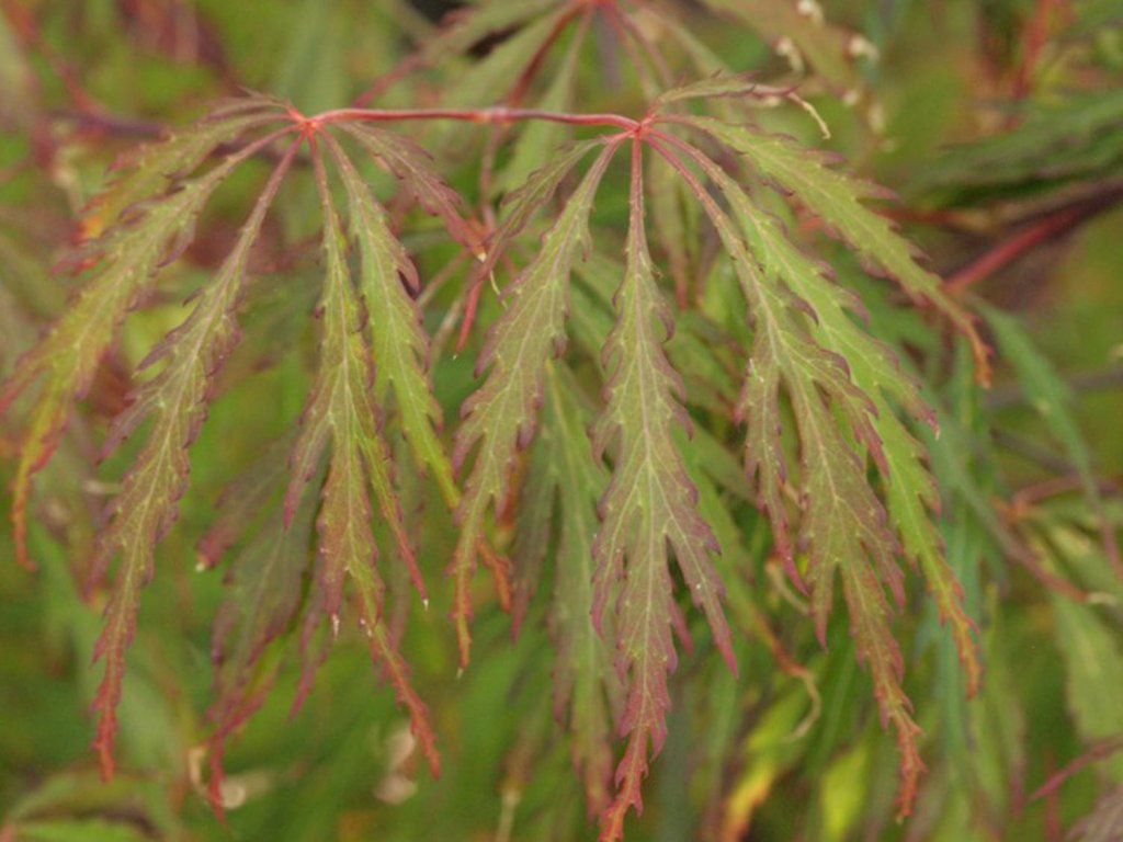 Japanischer Fächerahorn 'Usu-beni-shidare' - eine sehr interessante Ahornsorte, die eine Höhe von etwa 150 cm erreicht. Diese Höhe wird etwa im 10. Jahr nach der Pflanzung erreicht. Die Blätter sind fein und tief eingeschnitten. Im Frühling färben sie sich grün mit rotbrauner Umrandung, im Sommer sehen wir ein dunkleres Grün und im Herbst verzaubert uns der Ahorn mit orangen Tönen. Dank seines langsamen Wachstums ist er ideal für die Kultivierung im Topf.