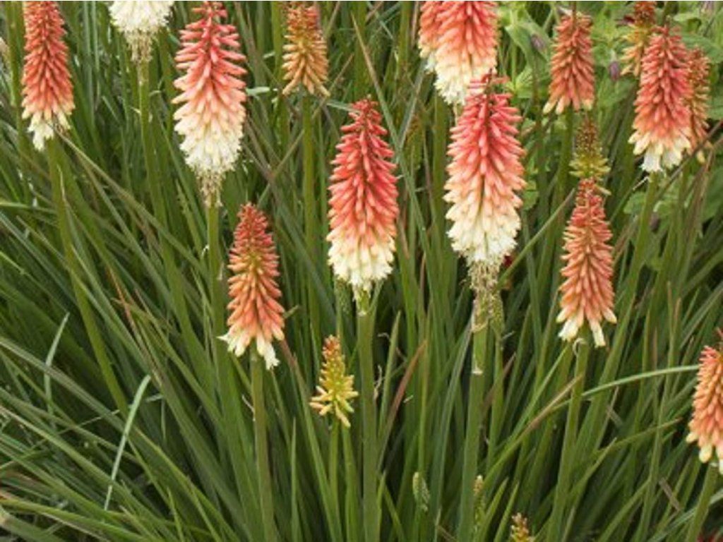 Kniphofia 'Vanilla' - eine beeindruckende Sorte, die etwa 1 m hoch wird. Von Juli bis September erscheinen zuerst ziegelrote Knospen, dann Blüten in aufrechten Ähren. Diese sind cremeweiß. Sie sind wahre Anziehungspunkte für Bienen und Schmetterlinge, geeignet zum Schneiden und für weitere Arrangements. Die Blätter sind tiefgrün, schmal und linealisch, optisch ähneln sie den Blättern von Taglilien. Ein wahres Schmuckstück für jeden Garten.