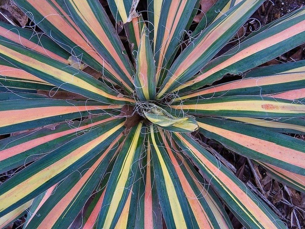 Yucca filamentosa 'Color Guard' - eine panaschierte Sorte mit einer ausgeprägten gelbgrünen Mitte des Blattes und einem grünen Rand, der seine Farbe vom Frühling bis zum Winter behält und in kälteren Perioden oft in Cremetöne übergeht. Die Rosette besteht aus steifen, schwertförmigen Blättern mit feinen, faserigen Fäden am Rand. Im Juli und August wächst über den Blättern ein kräftiger Stiel, normalerweise 120–180 cm hoch, mit einer Rispe von hängenden, weiß-cremefarbenen, glockenförmigen Blüten. Die Blüten werden von Bienen und Hummeln gerne besucht, nach dem Verblühen können sich Samenkapseln bilden. In der Komposition fungiert sie als ganzjähriger architektonischer Akzent für Schotterbeete, Hänge und trockenheitsliebende Stauden, wo sie die silbrigen Blätter von Lavendel, Heiligenkraut und Beifuß sowie die feine Struktur von Ziergräsern hervorhebt. Die Blätter haben steife Spitzen, daher eignen sie sich eher abseits von engen Durchgängen. Im Erwachsenenalter hat die eigene Blattrosette eine Höhe von ca. 40–60 cm und eine Breite von 60–90 cm, mit dem Alter kann sie mehr Rosetten bilden und sich allmählich zu einem Horst ausbreiten. Die Panaschierung ist in voller Sonne am ausgeprägtesten, im Halbschatten verengt sich der gelbe Streifen normalerweise und die Blätter werden grüner. Die Winterfärbung kann rötliche bis bronzefarbene Töne annehmen, die die grafische Zeichnung der Blätter unterstreichen. Der hohe Blütenstiel bildet eine vertikale Linie im Beet und kontrastiert gut mit niedrigen Polstern von Fetthenne, Thymian und Schwingel.