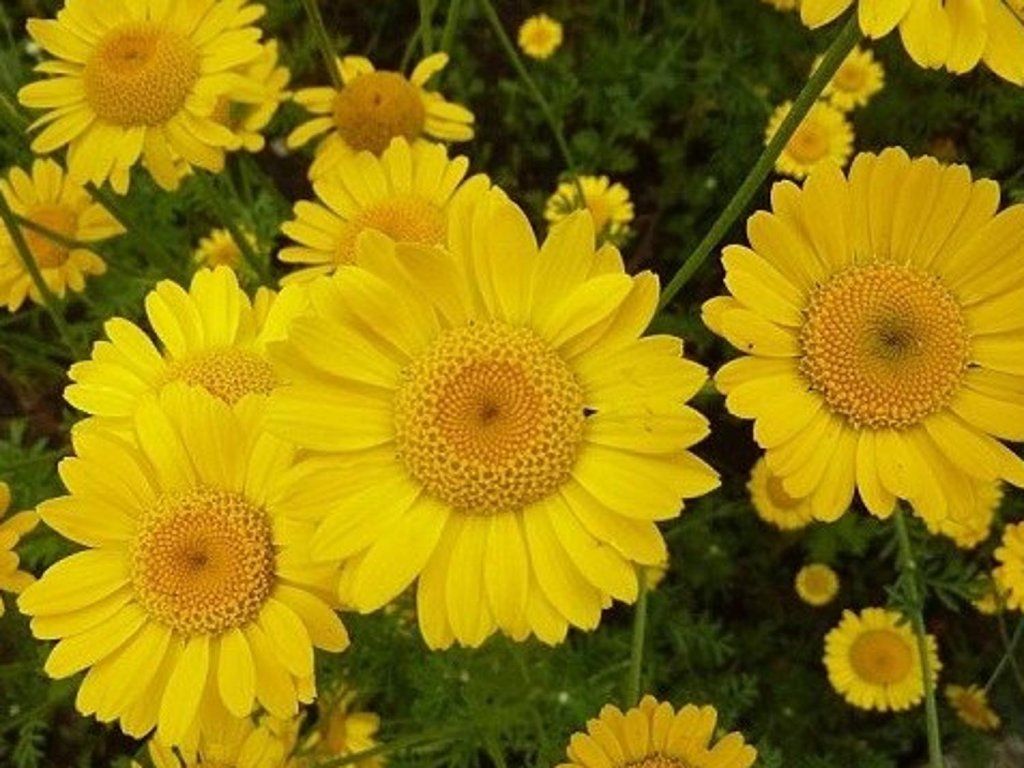 Färberhundskamille - Die Blütenblätter dieser Staude sind leuchtend gelb mit einem noch etwas dunkleren Zentrum und ähneln der Blüte einer Margerite. Sie erreicht eine Höhe von 60 - 70 cm. Blüht von Juni bis August. Zieht Schmetterlinge an. Früher wurde sie als Heilpflanze verwendet. Sie kommt als Teil eines Staudenbeetes gut zur Geltung.