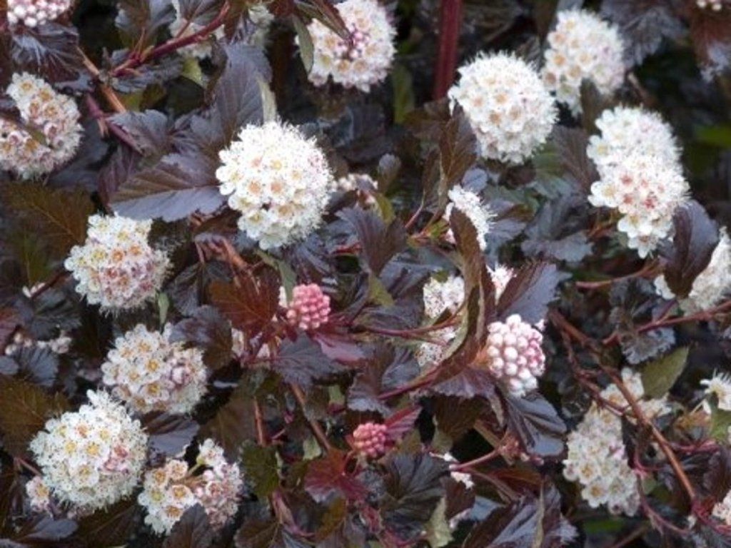 Blasenspiere 'Jonight' PBR Midnight - dieser Kultivar hat sehr dunkle Blätter, ein tiefes Weinrot, das fast an Schwarz grenzt. Die Blätter sind laubabwerfend, an den Rändern deutlich gezähnt und färben sich im Herbst rot. Ende des Frühlings blüht sie mit kleinen Büscheln weißer, honigtragender Blüten, die sich aus hellweinroten Knospen öffnen. Die Blüten werden von dunkelroten Früchten abgelöst. Sie erreicht eine Höhe von etwa 1-2 m.