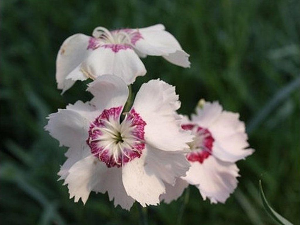 Nelken Feder 'Dixie® White Red Bicolor' - eine ausdauernde, immergrüne Pflanze, die bis zu 20 cm hoch wird. Eine horstbildende Staude, die eine bodennahe Blattrosette bildet. Auf den Stielen blühen gefüllte weiße Blüten mit einem roten Rand in der Mitte. Die Ränder der Blütenblätter sind gezahnt. Blüht von Juni bis Juli. Die Blätter sind grau-grün und linealisch. Diese schöne Sorte schmückt das Felsbeet, die Trockenmauer oder den Rand von Blumenbeeten. Auch für Gefäße geeignet.