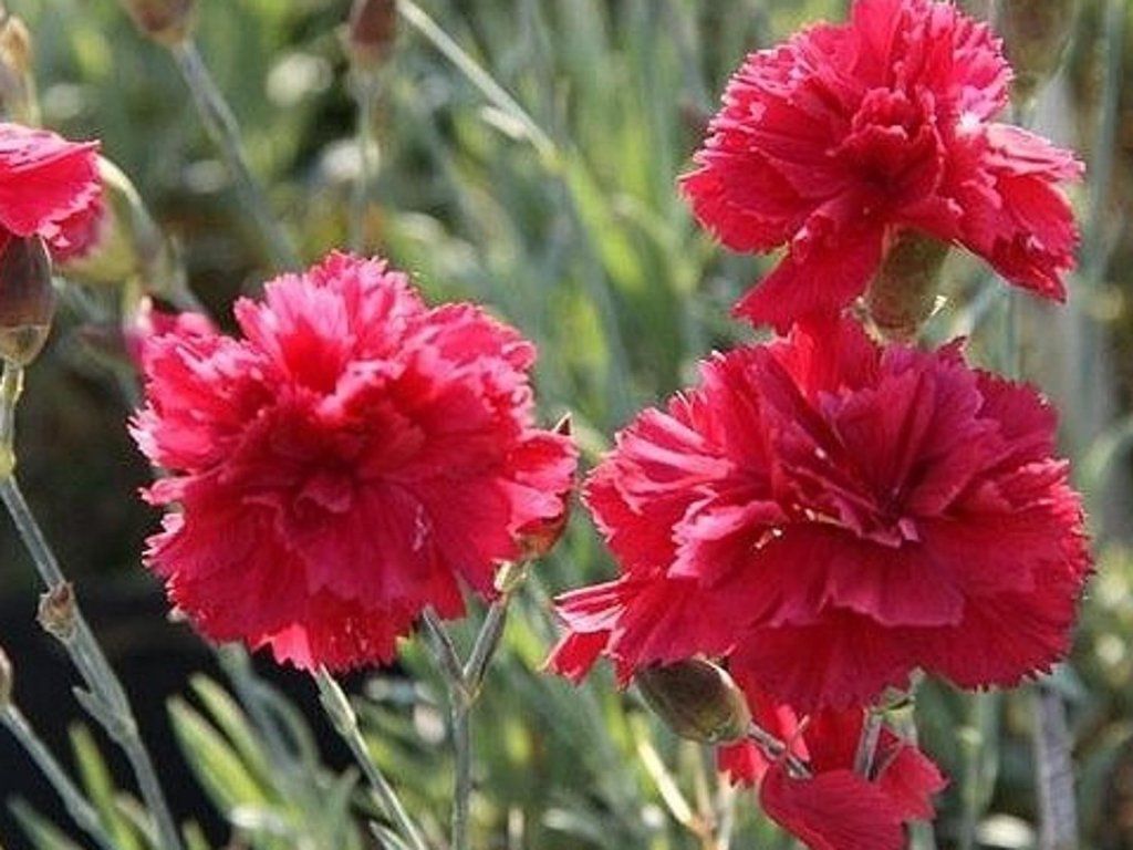 Feder-Nelke 'Heidi' - Anspruchslose, stark duftende und immergrüne Pflanze, die bis zu 40 cm hoch wird. Eine horstbildende Staude, die eine bodennahe Blattrosette bildet; auf geraden Stielen blühen rote, volle Blüten mit gezackten Rändern. Blüht von Juni bis August, entweder in lockeren Blütenständen oder einzeln. Die Blätter sind grau-grün und schmal. Verträgt keine Staunässe. Der ideale Standort ist in voller Sonne für Steingärten, Heidegärten oder Beete.