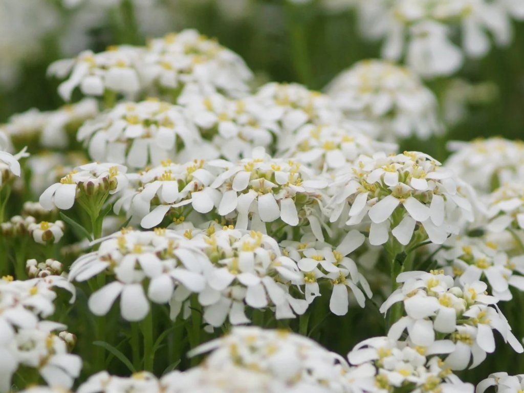 Iberis sempervirens 'Pygmaea' - niedrige, immergrüne Steingartenpflanze aus den steinigen, oft kalkhaltigen Standorten Süd- und Südosteuropas, wo sie auf flachen Böden zwischen Steinen und an sonnigen Hängen wächst. Die Sorte 'Pygmaea' behält alle Vorteile der Art, aber in noch kleinerem Maßstab: Sie bildet dichte, anliegende Polster aus schmalen bis eiförmigen Blättern, die in der Regel 1–2 cm lang sind. Das Laub bleibt auch im Winter sattgrün, kann sich in der kalten Jahreszeit leicht bronzefarben verfärben. Ende April und Anfang Mai erscheinen über dem Polster kurze Blütenstiele mit kleinen, vierzähligen Blüten, meist reinweiß mit gelblichem Zentrum. Die Blütenstände sind niedrig, aber dicht, so dass das blühende Polster wie eine helle „Hülle“ auf dem Felsen wirkt. Die Blüten werden von kleinen Bienen und Schwebfliegen besucht, obwohl die Pflanze keine Dornen oder andere mechanische Abwehrmechanismen aufweist. In der Komposition kommt sie gut mit trockenheitsliebenden Gräsern, Thymianarten, Fetthennen, Blaukissen oder niedrigen Purpurglöckchen zur Geltung. Dank ihrer kompakten Größe eignet sie sich für Fugen von Trockenmauern, für die Ränder von Schotterbeeten und für Schalengefäße, wo sie einen natürlich gepflegten, alpinen Charakter erzeugt und auch ohne häufige Eingriffe eine klare Linienführung der Bepflanzung beibehält.