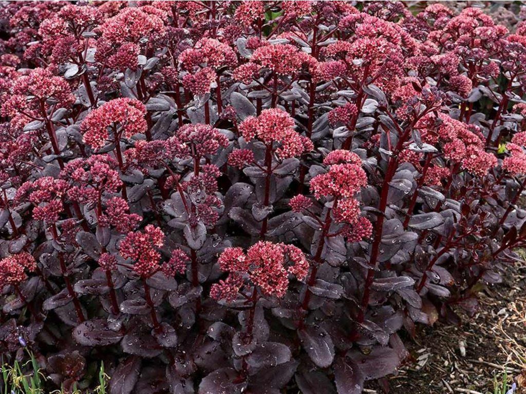 Fetthenne 'Touchdown Teak' - eine Fetthenne, die eine Höhe und Breite von etwa 30 - 40 cm erreicht. Sie bildet feste und aufrechte Stiele, die mit oval geformten, kleineren, fleischigen Blättern besetzt sind. Diese tragen eine dunkelweinrote bis dunkelbraune Farbe, die vom Frühling bis zum Herbst konstant bleibt. Um den August und September herum bilden sich Blütenstände aus kleinen Blüten, die Schattierungen von beige, rosa, rot und hellweinrot aufweisen – die Farbgebung variiert je nach Alter der Blüten. Die Pflanze ist ideal für Steingärten, wo sie farblich hervorsticht.
