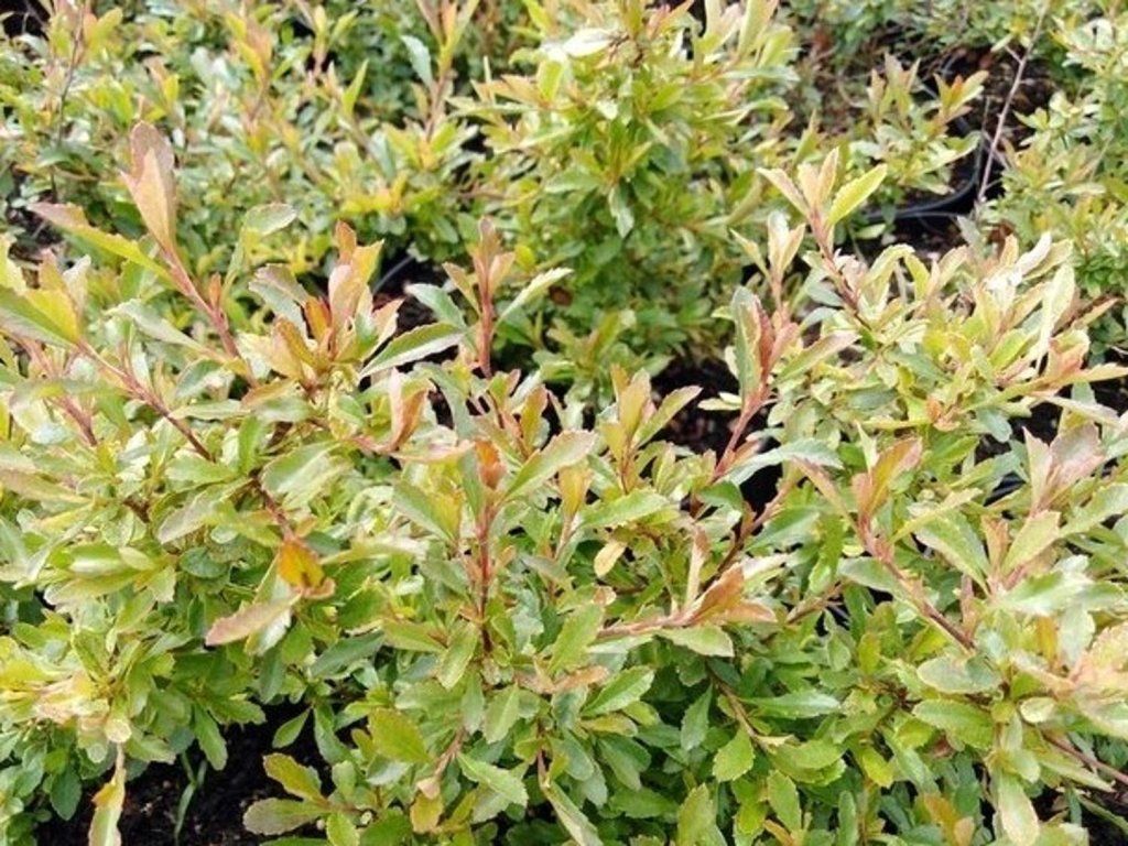 Feigenbaum 'Ces' - ein höherer, immergrüner Strauch, geeignet für die Kultivierung als Solitärpflanze oder für die Anlage von Hecken. An weinroten Zweigen werden ovale Blätter getragen, die beim Austreiben eine rosafarbene Färbung aufweisen; im Laufe der Saison sind sie dann in dunkleren, grünen Farbtönen. Von Mai bis Juli erscheinen eher unscheinbare weiße Blüten, aus denen sich im Herbst orangefarbene Beeren entwickeln.