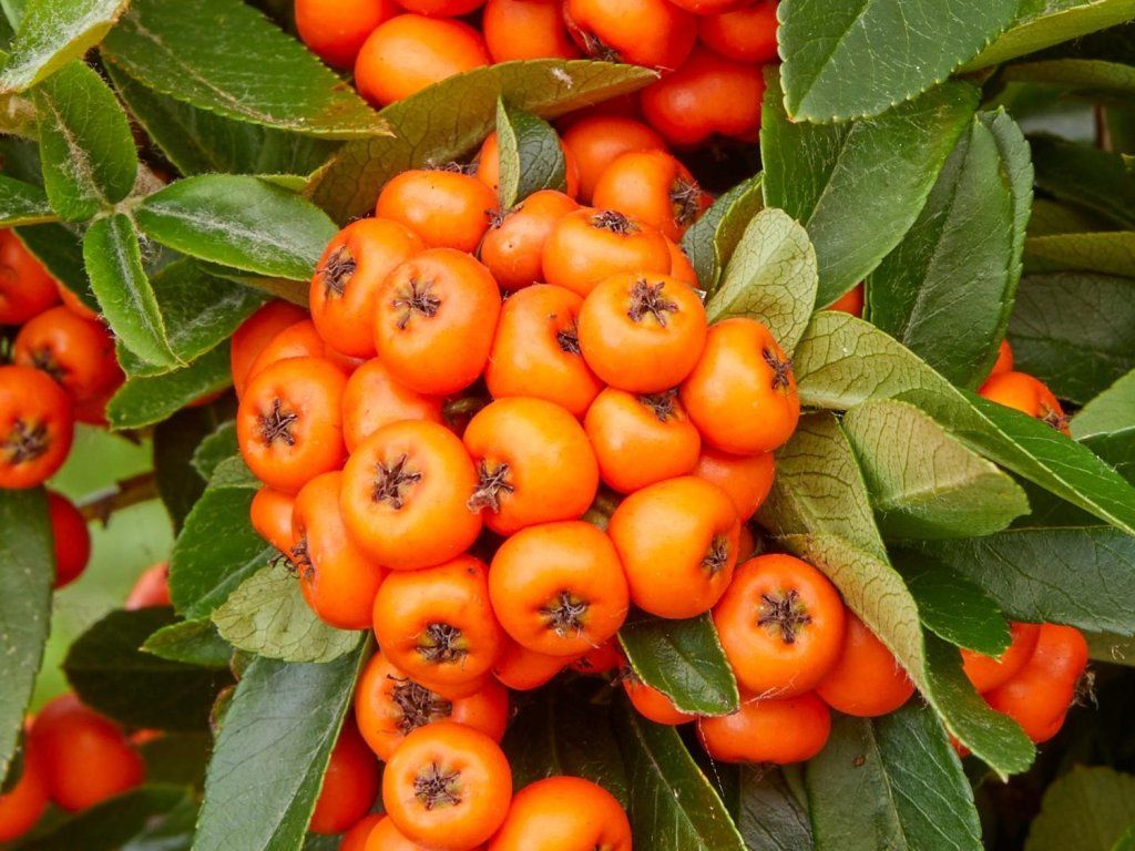 Feuerdorn 'Orange Star' – eine Sorte eines immergrünen bis halbimmergrünen Strauches aus Südosteuropa und Kleinasien. Die Züchtung wurde von der niederländischen Baumschule Van der Sar VOF eingeführt und erhielt 2021 den Plantarium Innovation Award, bei der vor allem das Fehlen von Dornen und die langes Haften der Früchte hervorgehoben wurden. Er zeichnet sich durch einen aufrechten, schmaleren Wuchs und eine sichere Handhabung aus, was bei Pflanzungen am Eingang, entlang von Gehwegen und bei geformten Hecken geschätzt wird. Ein ausgewachsener Strauch erreicht normalerweise eine Höhe von etwa 2 m und eine Breite von etwa 1 m; an einer Rankhilfe kann er als Spalierstrauch gezogen werden. Die Blätter sind ledrig, dunkelgrün, schmal elliptisch, etwa 2–4 cm lang und bleiben in milderen Wintern oft erhalten. Von Mai bis Juni öffnen sich an kurzen Seitenästen flache Blütenstände mit kleinen weißen Blüten, die einen zarten Duft verströmen und Pollen sowie Nektar liefern. Ab September reifen runde orangefarbene Scheinfrüchte, die lange bis in den Winter am Strauch haften und eine begehrte Nahrungsquelle für Vögel darstellen. Die Früchte sind nicht zum Verzehr bestimmt. Die Sorte gilt als weniger anfällig für den Feuerbrand und Phytophthora ramorum, was die Zuverlässigkeit bei Pflanzungen erhöht. In der Komposition kontrastiert er gut mit dunkelgrünen Nadelgehölzen, Lavendel, Salbei, Ziergräsern und Zwiebelblumen im Vordergrund.