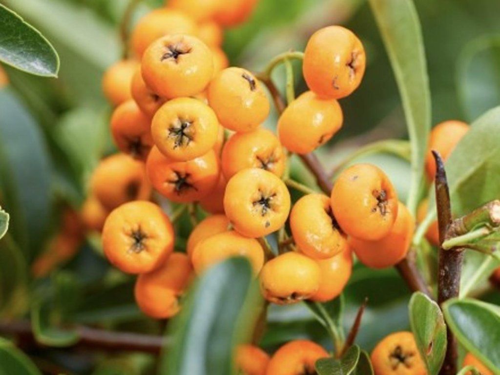 Feuerdorn 'Sunny Star' - ein dorniger, immergrüner bis halbimmergrüner Strauch aus Südosteuropa und Kleinasien, der sich durch seine ganzjährige Struktur im Garten auszeichnet. Die Sorte 'Sunny Star' gehört zu den neueren Auslesen, die für ihr ausgeprägt panaschiertes Laub und ihre hell gefärbten Früchte geschätzt werden. Er wächst dicht und überwiegend aufrecht, meist 2–3 m hoch und 1–1,5 m breit, wodurch er ein schmaleres Profil als ausladende Typen aufweist. Die Triebe tragen Dornen von etwa 1–3 cm Länge; bei dieser Sorte sind sie meist spärlicher, was den Schnitt und die Führung am Weg erleichtert. Die Blätter sind ledrig, schmal elliptisch, etwa 2–4 cm lang, dunkelgrün mit einem ausgeprägten gelben Rand und bleiben im milderen Winter oft am Strauch erhalten. Von Mai bis Juni öffnen sich auf kurzen Seitenästen flache Blütenstände aus kleinen weißen Blüten, die Bestäubern Pollen und Nektar bieten. Ab September reifen runde Apfelfrüchte in Gelb- bis Gelborangetönen, die oft bis in den Winter am Strauch verbleiben und auch als Vogelfutter dienen. Die Früchte sind nicht zum Verzehr bestimmt. In der Komposition wird 'Sunny Star' als schmale Hecke, sicherere Barriere und als Wandstrauch an einer warmen Mauer eingesetzt, wo er mit dunkelgrünen Gehölzen, Ziergräsern, Lavendel oder Salbei kontrastiert.