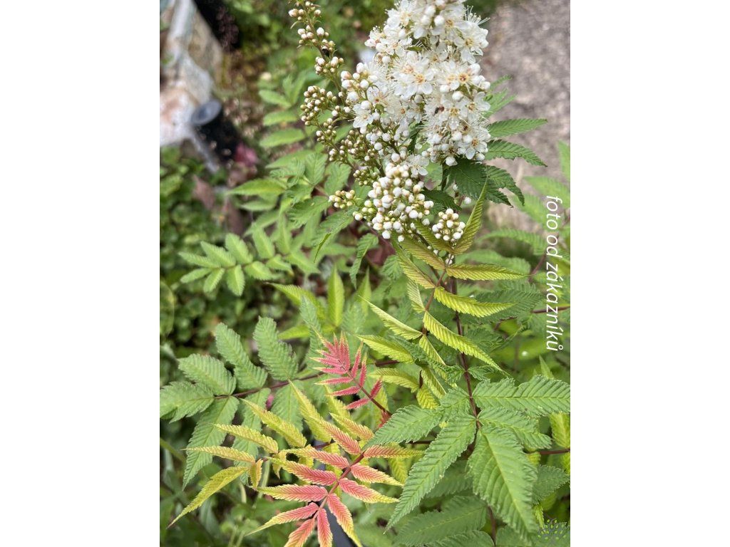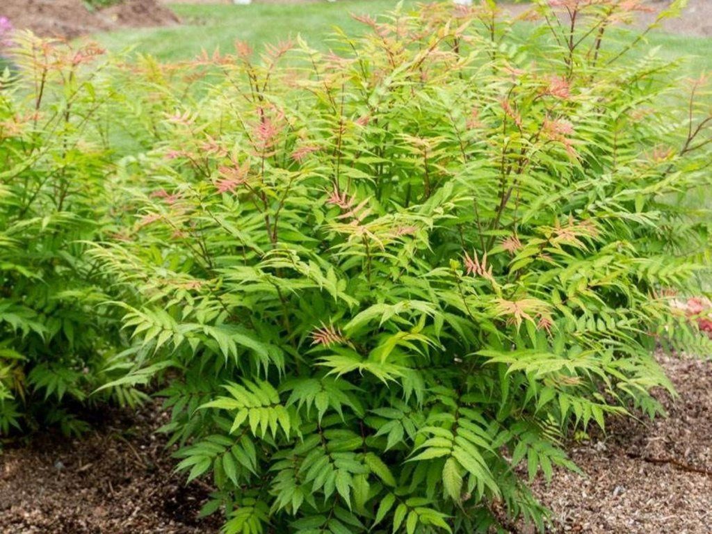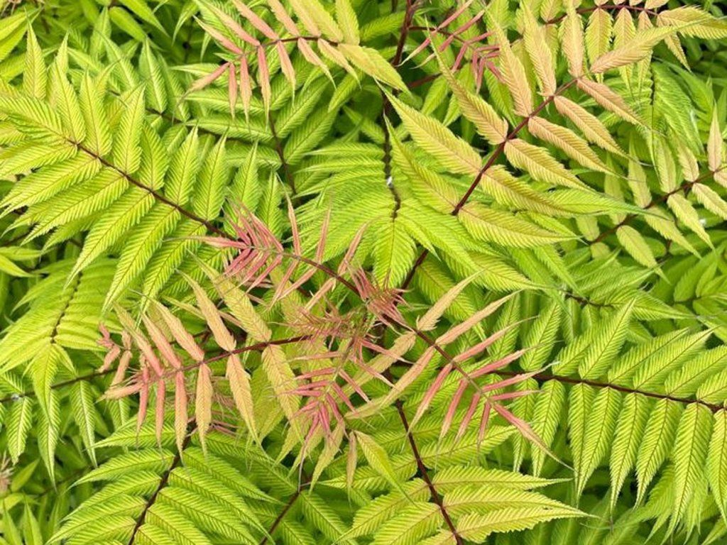 Ebereschenblättrige Fiederspiere ist ein schnell wachsender, laubabwerfender Strauch aus Ostasien, der vor allem für seine großen, gefiederten Blätter, ähnlich denen der Eberesche, und seine üppige Sommerblüte geschätzt wird. Er erreicht normalerweise eine Höhe von 1,5–3 Metern und bildet dichte, ausladende Bestände dank seiner starken Ausbreitungsfähigkeit. Er eignet sich sehr gut für naturnahe Pflanzungen, größere Gärten und als undurchdringliche Hecke.Blüht im Juni bis Juli, wenn sich an den Triebspitzen aufrechte, kegelförmige Rispen aus kleinen cremeweißen Blüten zeigen. Die Blüten sind leicht duftend und sehr attraktiv für Bienen und andere Bestäuber. Nach der Blüte bleiben trockene Rispen zurück, die entfernt werden können, aber nicht unbedingt störend sind. Die Früchte haben keinen nennenswerten Zierwert. Die Blätter treiben im Frühling bronzerot aus, werden allmählich grün und färben sich im Herbst gelb bis orange. Der Strauch ist während der gesamten Vegetationsperiode dekorativ, auch wenn seine Hauptwirkung eher in der Blattmasse als in den Blüten liegt.