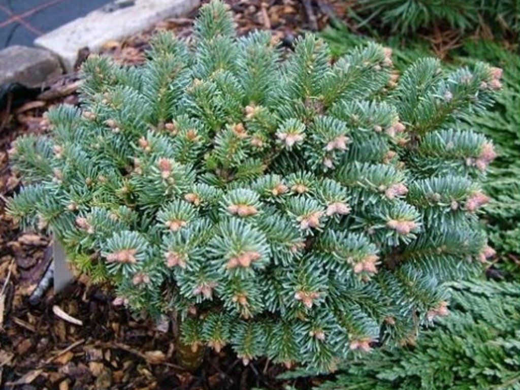 Felsengebirgs-Tanne 'Alpin Beauty' - eine miniaturwüchsige und sehr langsam wachsende Tanne. Mit 10 Jahren erreicht sie eine Höhe von 0,2 - 0,3 m, die jährlichen Zuwächse betragen etwa 25 mm. Sie bildet einen flachkugeligen Wuchs, der dicht ist und allmählich eher eine konische Form annimmt. Die Nadeln haben eine blaue, blaugrüne oder silbrigblaue Farbe. Sie sind glänzend und dicht. Die Pflanze eignet sich für Heidegärten, Steingärten oder für Gefäße.