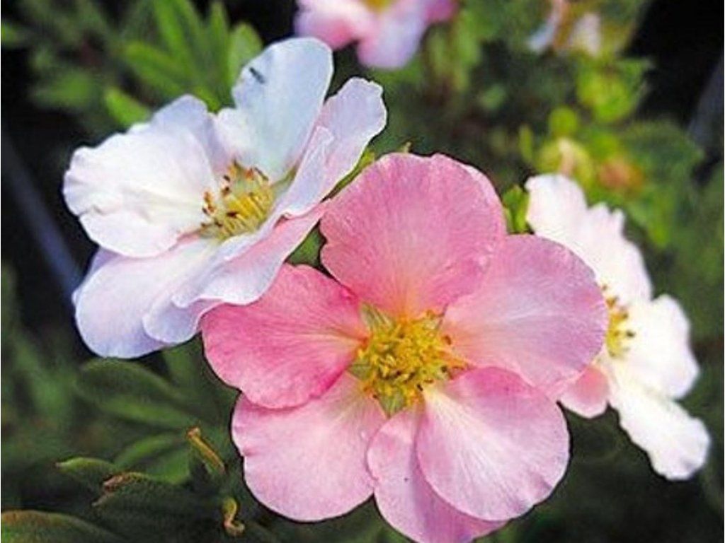 Potentilla fruticosa 'Glenroy Pinkie' - niedriger, aber ausladender Strauch, der im Erwachsenenalter eine Höhe von 0,6 m erreicht. Sie hat kleine, schmale Blätter von 2,5 cm Länge in dunkler grüner Farbe. Die Blüten sind flach, zart hellrosa gefärbt mit einem leuchtend gelben Zentrum. Sie blühen ab Ende des Sommers. Der Strauch ist pflegeleicht und eignet sich perfekt für niedrige Hecken, zur Abgrenzung von Beeträndern usw.