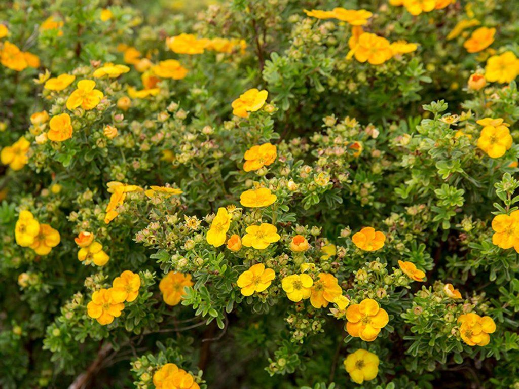 Potentilla fruticosa 'Jefman' PBR Mandarin Tango - kompakt wachsender, niedriger Strauch, der eine Höhe von etwa 60 cm erreicht. Von Ende des Frühlings bis zum Herbst blühen gelb-orange, fünfzählige Blüten in Mandarintönen, die sich im Herbst langsam in dunklere Farben ändern. Die Nadeln sind dunkelgrün. Der Strauch ist pflegeleicht, leidet nicht an Krankheiten und eignet sich für nahezu jeden Boden.