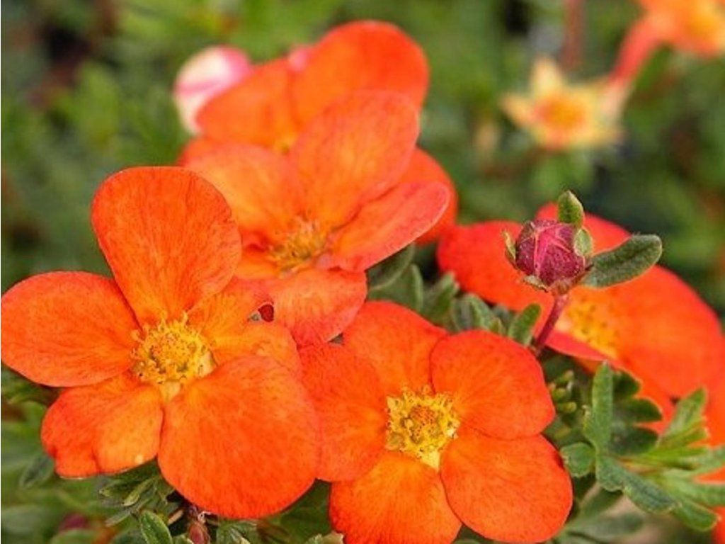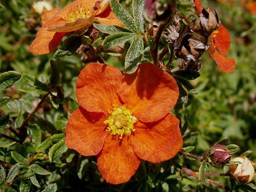 Fünffingerstrauch 'Red Ace' - ein niedriger Laubstrauch aus der Familie der Rosengewächse. Die Sorte 'Red Ace' bildet einen dichten, fein verzweigten Strauch von etwa 0,4–0,6 m Höhe, unter günstigen Bedingungen bis zu etwa 0,7 m, mit einer Breite von etwa 0,6–1 m. Die Triebe sind dünn, vielfach verzweigt und tragen kleine, unpaarig gefiederte Blätter, die aus schmalen Blättchen von mittel- bis hellgrüner Farbe bestehen. Das Laub wirkt zart, bildet aber gleichzeitig einen dichten Bewuchs, der den Boden gut bedeckt und Unkrautwuchs verhindert. Von Mai bis Oktober erscheinen an den Spitzen junger Triebe einfache, schalenförmige Blüten mit einem Durchmesser von etwa 3 cm, die orange-rot bis rot-orange mit einer gelben Mitte sind. Bei voller Sonne können die Blüten allmählich in orangere Töne übergehen, im leichten Halbschatten behalten sie ihre intensivere Farbe länger bei. Die Blüte erfolgt in Wellen, sodass Knospen, geöffnete Blüten und verblühte Blütenstände gleichzeitig am Strauch vorhanden sind und die gesamte Pflanze die meiste Zeit der Saison lebendig wirkt. Die Blüten werden von Bienen und anderen bestäubenden Insekten angeflogen, daher ist Fingerkraut auch für naturnahe Pflanzungen geeignet. Die Früchte in Form von kleinen Nüsschen haben keine Bedeutung für die kulinarische Verwendung, die Pflanze wird als reine Zierpflanze eingesetzt. In der Gartengestaltung wird 'Red Ace' in niedrigen Strauchgruppen, als Rand von gemischten Staudenbeeten, an Hängen zur Bodenstabilisierung oder als niedriger, freistehender Heckenstrauch verwendet. Sie lässt sich gut mit graulaubigen und immergrünen Sträuchern wie Spiersträuchern oder niedrigen Wacholderarten sowie mit Ziergräsern kombinieren, deren Texturen die warmen Blütenfarben hervorheben.
