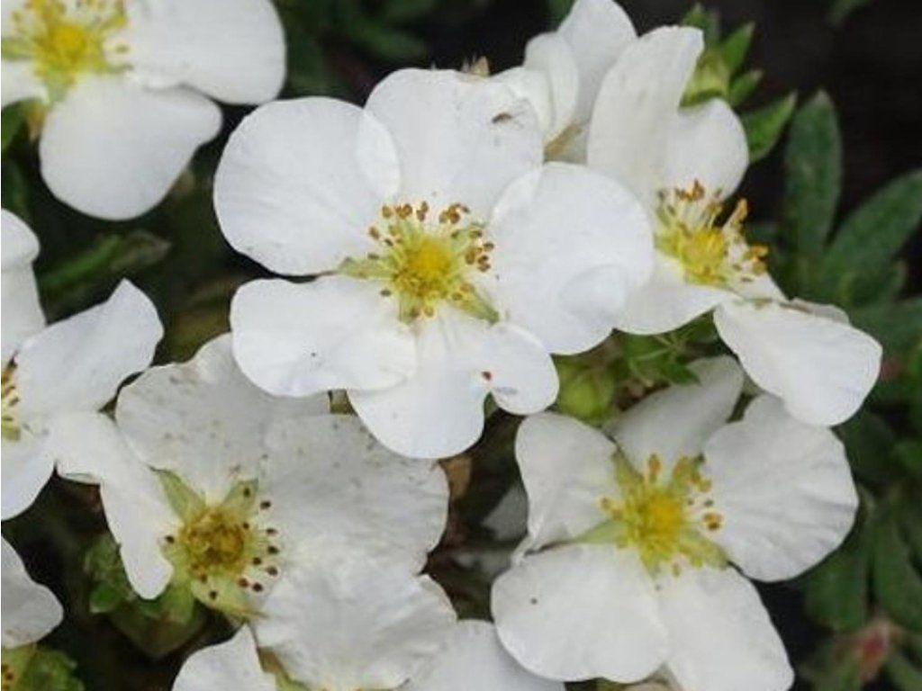 Potentilla fruticosa Bella Bianca 'Hachbianca' - kompakt wachsender Strauch, erreicht eine Höhe von 50cm. Sie hat dunkelgrüne Blätter und ist vom Sommer bis Oktober buchstäblich übersät mit zahlreichen reinweißen kleinen Blüten mit gelber Mitte. Sehr widerstandsfähige Pflanze gegen Krankheiten und Frost, auch für die Topfkultur geeignet.