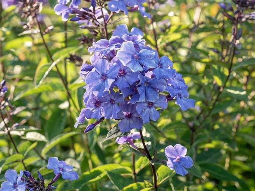 Phlox paniculata 'Blue Paradise' - nordamerikanische Staude aus feuchteren Waldrändern und Bachufern. Die Sorte 'Blue Paradise' wurde um 1990 vom niederländischen Gartenarchitekten Piet Oudolf ausgewählt und eingeführt und wurde in Europa wegen der Blütenfarbe und der guten Mehltauresistenz beliebt. Sie bildet einen aufrechten Horst von etwa 80–100 cm Höhe und 40–60 cm Breite, mit dunkleren Stielen und lanzettlichen grünen Blättern. Die Blüten sind in dichteren, leicht gewölbten Rispen von etwa 10–18 cm angeordnet, die einzelnen Blüten sind etwa 3–4 cm breit. Interessant ist die Farbveränderung im Laufe des Tages: morgens öffnen sie sich in einem violett-blauen Ton, tagsüber können sie eher purpurfarben wirken und in der Dämmerung kehren sie zu einem kühleren Blau zurück. Der Duft ist würzig-süß, erinnert oft an Vanille mit Nelken, und die Blüten bieten Nektar für Bienen und Schmetterlinge. Die Blütenstiele sind für den Schnitt geeignet und lassen sich im Beet gut mit weißen Margeriten, gelben Sonnenhüten, Storchschnäbeln und zarten Gräsern kombinieren. Sie ist eine ausgezeichnete Wahl für Gärtner, die eine pflegeleichte Pflanze mit schönen blauen Blüten und einem angenehmen Duft suchen. Sie eignet sich für verschiedene Gartenstile und kann leicht in verschiedene Gartengestaltungen integriert werden.