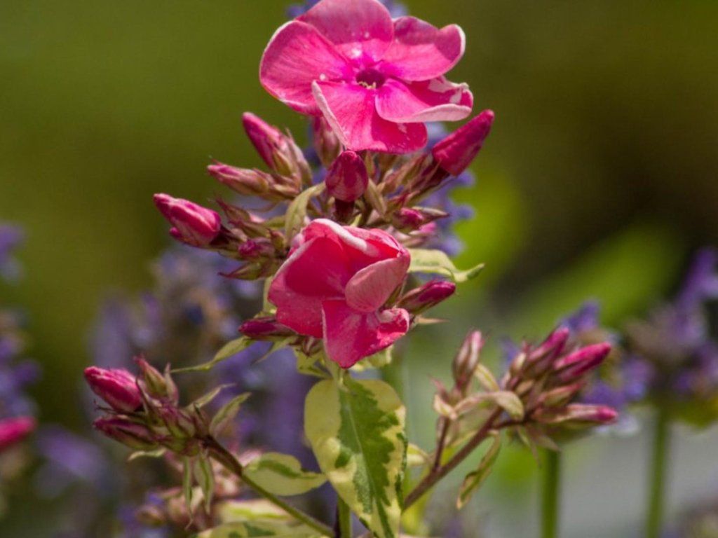 Phlox paniculata 'Elizabeth' - eine nordamerikanische Staude aus Auenwäldern und feuchteren Wiesen, die in Europa bereits seit dem 18. Jahrhundert kultiviert wird. Die Sorte 'Elizabeth' stammt aus niederländischer Züchtung, als Autor wird B. Noordhuis genannt und sie taucht in der Literatur im Jahr 2003 auf. Die Pflanze bildet feste, aufrechte Stängel und erreicht im Erwachsenenalter normalerweise eine Höhe von 60–70 cm, die Breite des Horstes beträgt etwa 40–60 cm. Das auffälligste Merkmal ist das Laub, die schmal lanzettlichen Blätter sind mittelgrün und breit cremegelb gerandet, sodass der Horst auch ohne Blüte hell wirkt. Von Juni bis September bilden sich an den Triebspitzen 10–15 cm breite Rispen mit zahlreichen Knospen. Die Blüten sind leuchtend rosa, oft mit einer helleren Mitte, röhrenförmig und duftend. Die Blüte eignet sich gut für Sommersträuße und lockt gleichzeitig Schmetterlinge und Bienen an. Im Garten kommt sie in Kombination mit blau blühenden Stauden, mit Wiesensalbei, Katzenminze, Storchschnäbeln oder Ziergräsern gut zur Geltung, die panaschierten Blätter lockern auch Pflanzungen mit dunkelblättrigen Purpurglöckchen auf.