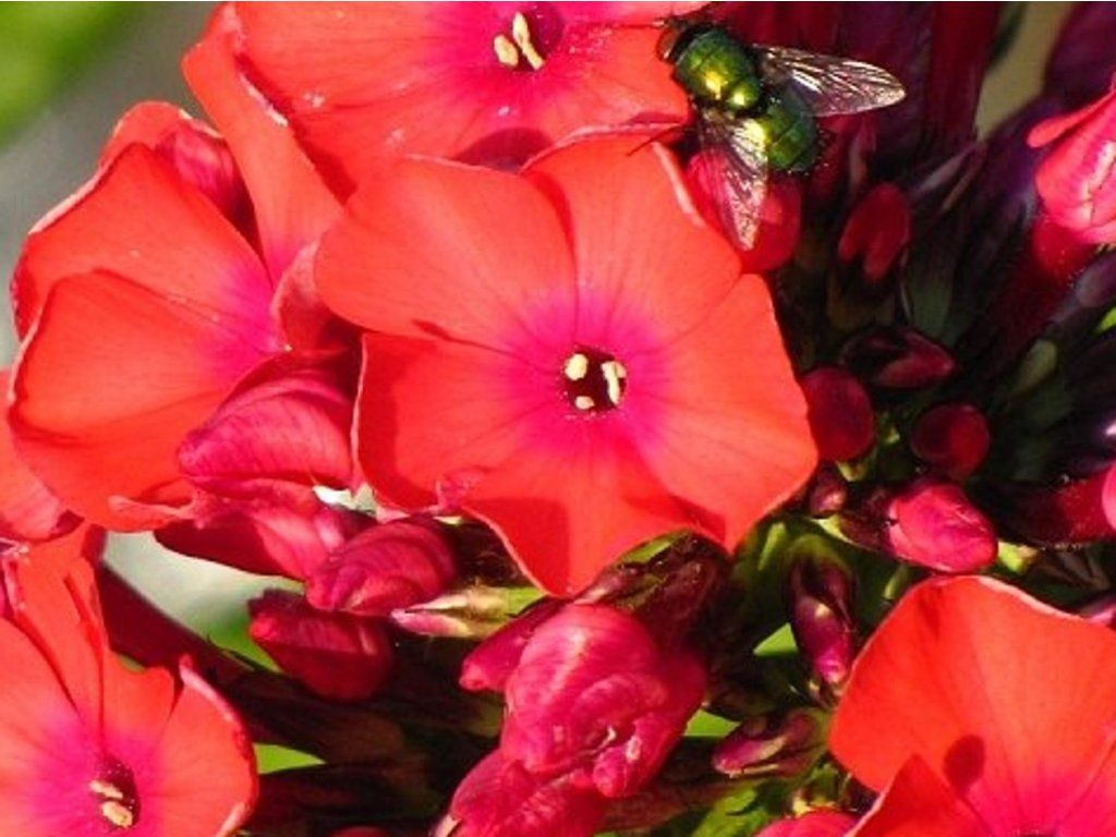 Phlox paniculata 'Orange' - eine Staude, die bis zu 70 cm hoch wird, hellrote Blütenfarbe reicht bis ins Spektrum von warmem Rot bis fast Orange.