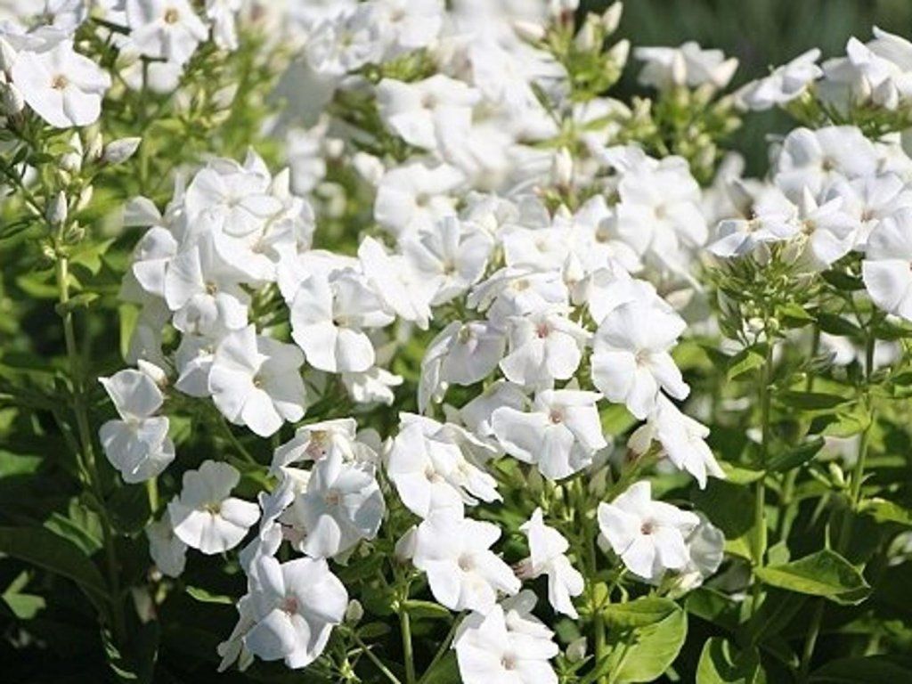 Phlox paniculata 'Younique White' - Anspruchslos, lange blühend und interessant duftend. Besonders an Sommerabenden verströmen sie einen besonderen, würzigen Duft. Phloxe sind sehr widerstandsfähige Stauden mit kräftigen Stielen und mittelgrünen, lanzettlichen Blättern, insbesondere im unteren Teil der Stiele. Der Anbau ist nicht anspruchsvoll. Sie mögen normalen Beetboden, ausreichend Nährstoffe, aber auch ohne Düngung werden sie reichlich blühen. Sie sind langlebig und bleiben im Garten, bis Sie sie ausgraben. Ideal für ein sonniges Beet, aber sie blühen auch im Halbschatten. Winterhart bis ca. -34 °C.