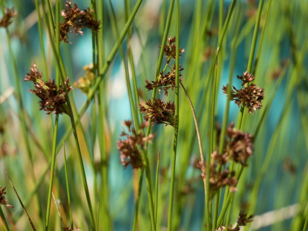 Flatter-Binse - eine Pflanze aus der Familie der Binsengewächse (Juncaceae). Die Flatter-Binse ist eine horstbildende, ausdauernde Pflanze, die Büschel von Stängeln bildet. Die Stängel sind aufrecht, hohl und oft fein gerillt. Die Blätter sind klein, schmal und winden sich spiralförmig um den Stängel. Die Blätter sind normalerweise länger als die Stängel und haben eine dunkelgrüne Farbe. Die Blüten sind klein, braun und in Blütenständen an der Spitze der Stängel gruppiert. Nach der Blüte bildet die Flatter-Binse einen kugelförmigen Fruchtstand, der Samen enthält. Die Flatter-Binse kann je nach Umweltbedingungen und Sorte 30 bis 100 Zentimeter hoch werden. Sie ist beliebt für ihre Fähigkeit, interessante Texturen und Strukturen in feuchten Umgebungen zu schaffen, und kann auch zum Schutz von Ufern vor Erosion dienen.