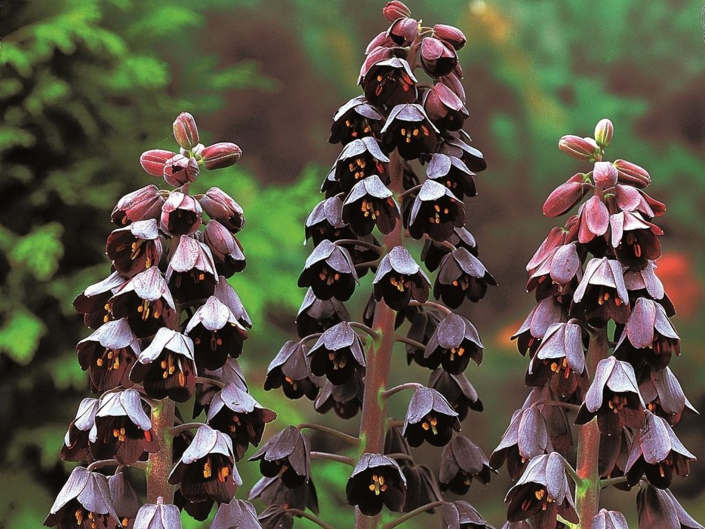 Fritillaria persica 'Adiyaman' - eine stattliche exotische Zwiebelpflanze. Der lange, gerade Stängel erreicht im Erwachsenenalter eine Höhe von 85-100 cm. Im unteren Teil befinden sich olivgrüne bis graugrüne, bereifte, lanzettliche, bis zu 15 cm lange Blätter. Der traubenförmige Blütenstand, der aus 10-50 kleinen glockenförmigen Blüten besteht, ist hell- bis dunkelviolett, die Innenseite kann bräunlich sein. Sie beginnen bereits im April und Mai zu blühen. Seignet sich hervorragend als Ergänzung zu höheren Gehölzen, Staudenbeeten oder als Solitär. Insgesamt ist diese Pflanze ein schönes Element für Gärten und verleiht jedem Garten ein erhabenes und anmutiges Aussehen.